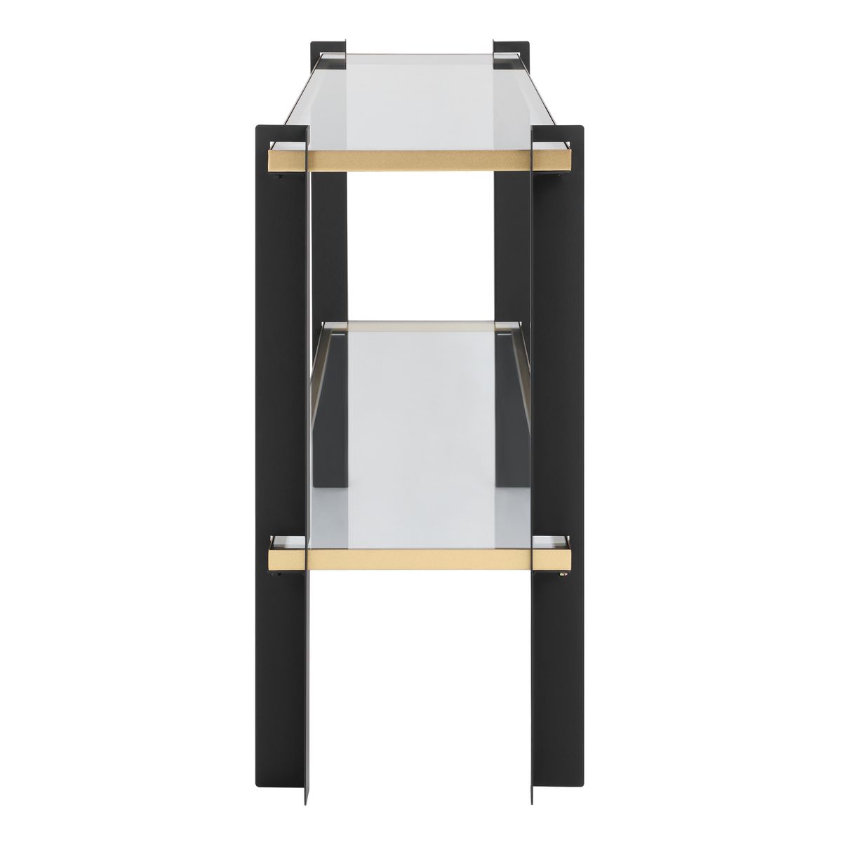 Современный консольный столик на стильных железных ножках, отделанных двухцветной матовой чёрно-золотой фольгой. Стол также оснащён столешницей и галерейной полкой из закалённого прозрачного стекла, что обеспечивает простор и элегантность.