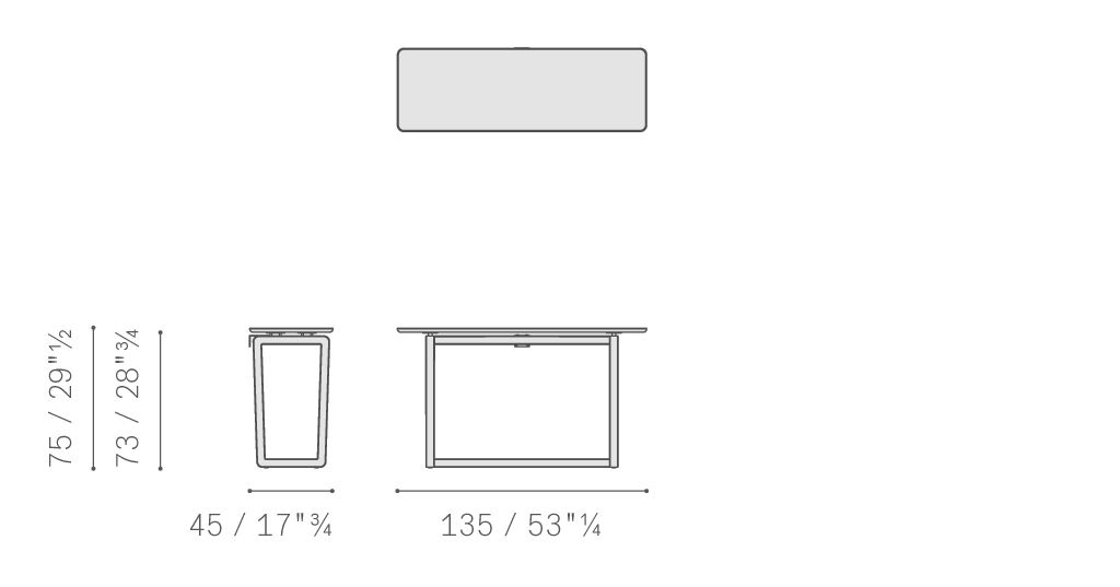 Консоль Fidelio высотой 75 см, шириной 135 см и глубиной 45 см. Основание из массива ясеня с морилкой цвета мокко или венге поддерживает две двойные стойки треугольного сечения. Стальные крепежные пластины окрашены в матово-чёрный цвет. Стальные распорки с рутениевым покрытием. Основу защищает самоклеящийся войлок. Столешница из мрамора Emperador или Calacatta Gold с полированной отделкой и прозрачной полиэфирной защитой. Возможна версия столешницы из берёзовой фанеры, обитой кожей Saddle Extra. Рекомендуется крепление к стене для повышения устойчивости. Задняя монтажная пластина из стали, окрашенная в матово-чёрный цвет, с возможностью регулировки глубины ±6 мм.