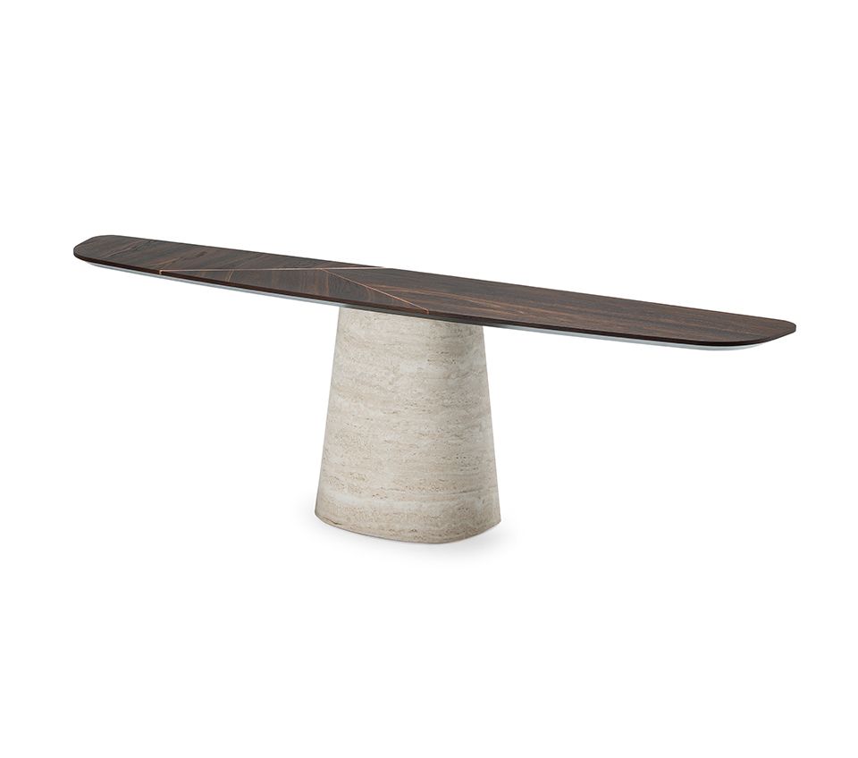 Столы Rado с центральным основанием соединены двумя идеально симметричными ступицами. На короткой стороне цоколя заметна одна деталь: углублённая вертикальная канавка, покрытая керамикой, которая разбавляет в целом однородную поверхность. В результате получился современный керамический стол , воплощающий новую современную эстетику, сочетающий классическую отделку, вдохновлённую натуральным мрамором, с ранее невиданными технологиями производства.