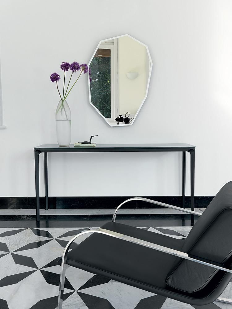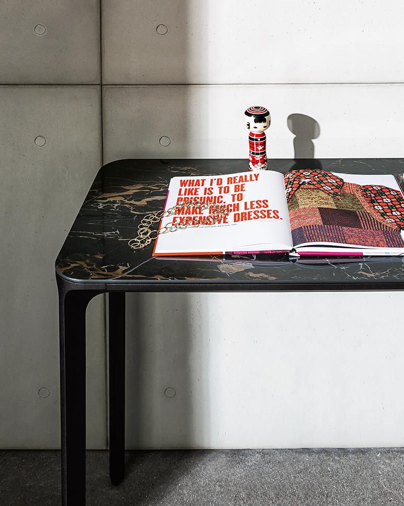 Консоль с четырьмя литыми алюминиевыми ножками, полированным хромом или лакированным покрытием (различные варианты отделки), а также анодированным или лакированным алюминиевым профилем (различные варианты отделки). Столешница доступна из закалённого или матового лакированного стекла толщиной 8 мм (различные цвета), а также из материала Materia или керамики (различные варианты отделки). Деревянная столешница доступна в версии с четырьмя ножками.