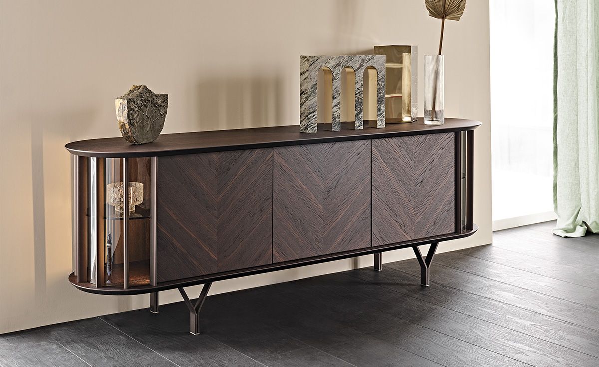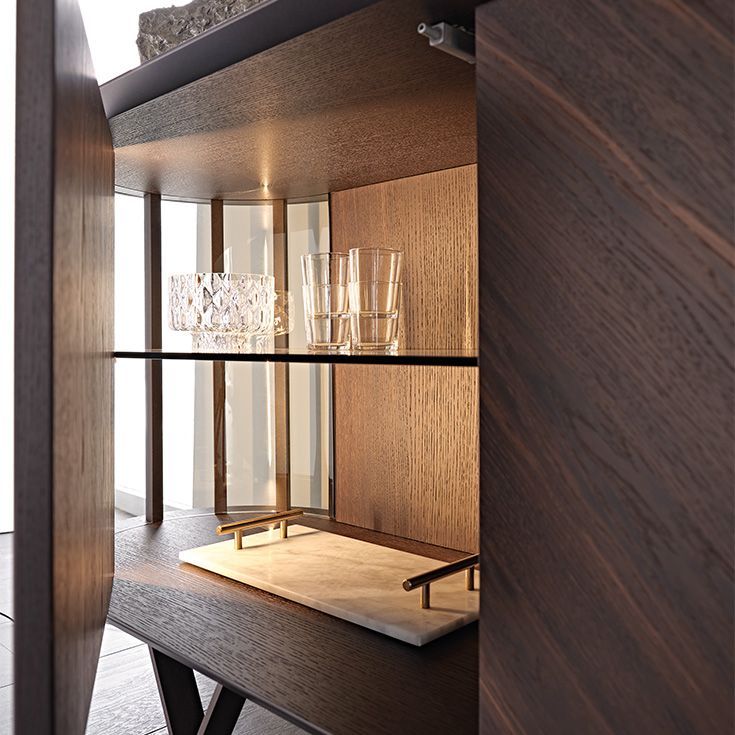 Этот современный деревянный комод, разработанный Tosca Design, богат деталями и в то же время отражает простую и чистую эстетику. Изогнутые боковые стороны из прозрачного стекла пересекаются вертикальными металлическими вставками, которые придают ритм композиции, оставляя проблеск внутренних полок из стекла. Но главная отличительная деталь - это изысканные ножки, состоящие из двух металлических элементов, которые образуют Y, изящно опирающуюся на пол. Деревянные дверцы сделаны из диагональных планок, которые подчеркивают очаровательную естественную текстуру дерева. Этот современный комод изготовляется с 2 или 4 дверями, чтобы естественно вписаться в любое пространство дома. Завершает линию версия Costes TV, более низкая и с изогнутыми боковыми сторонами. Стиль - изысканный, но сбалансированный, результат тщательного внимания к деталям, которые отличают итальянскую мануфактуру. Внутренние полки из дымчатого стекла предназначены для хранения и демонстрации самых ценных предметов внутри этого привлекательного дизайнерского комода.