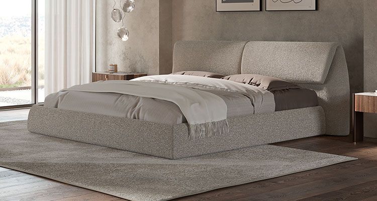 Каркас кровати изготовлен из натуральной древесины и полностью скрыт под обивкой из формованного пенополиуретана. Внешняя отделка рамы кровати и мягкого изголовья с визуально загнутыми краями выполнена из ткани, которая состоит из смеси хлопка и полиэстера. Эта ткань представлена в нескольких вариантах цветового исполнения.