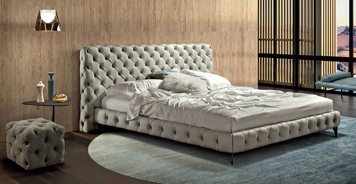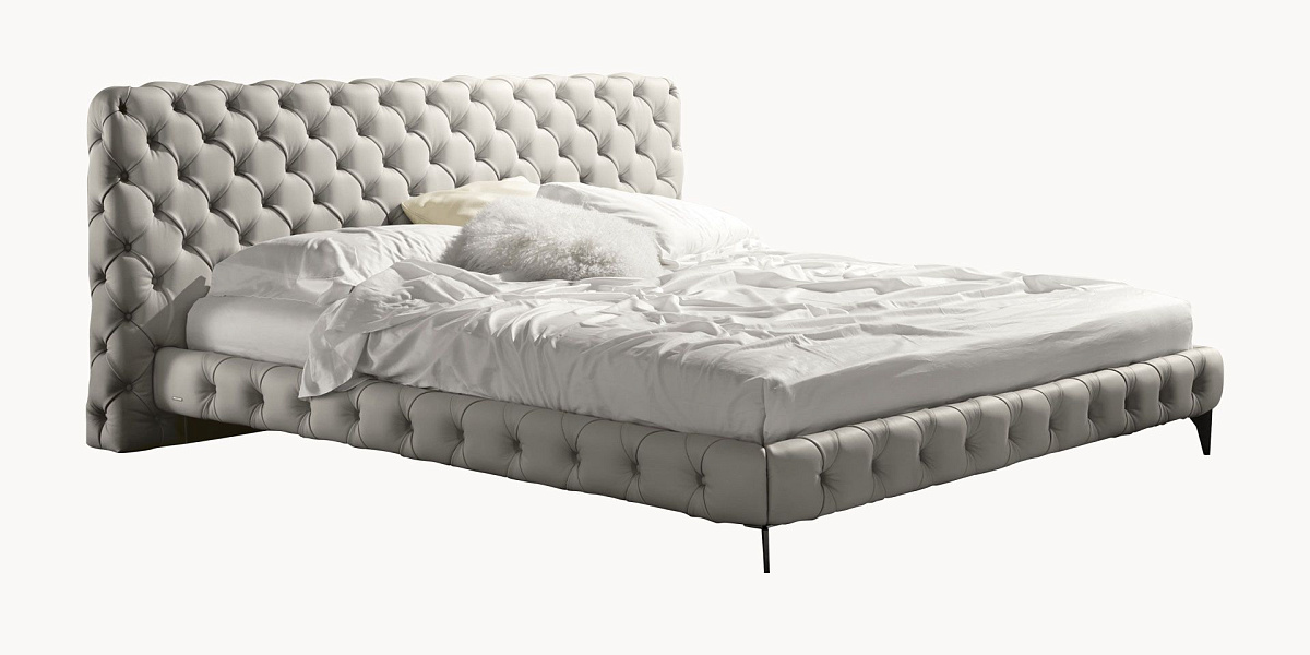Кровать Aston от фабрики Gamma Italia имеет солидное изголовье выполненное в стиле картеная стяжка. У кровати ровное основание на ножках и матрас вкладного типа. Спинка и основание декорированы каретной стяжкой на мягком объемном слое ППУ.