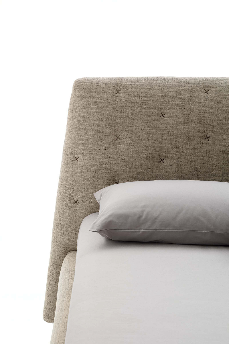 Кровать со стеганым изголовьем с контрастной Х-образной строчкой.
