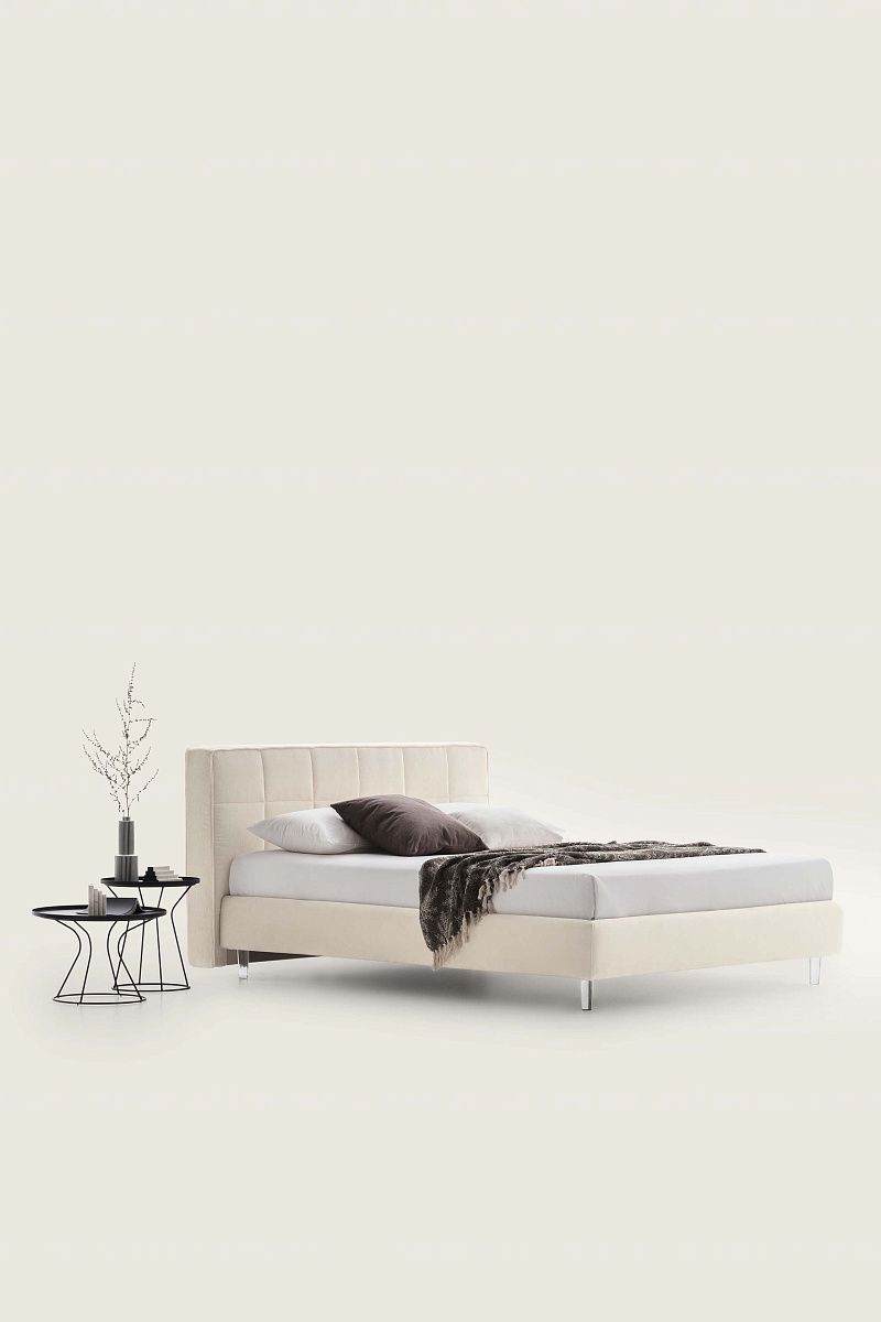 Кровать с квадратным изголовьем со стеганым квадратным мотивом.