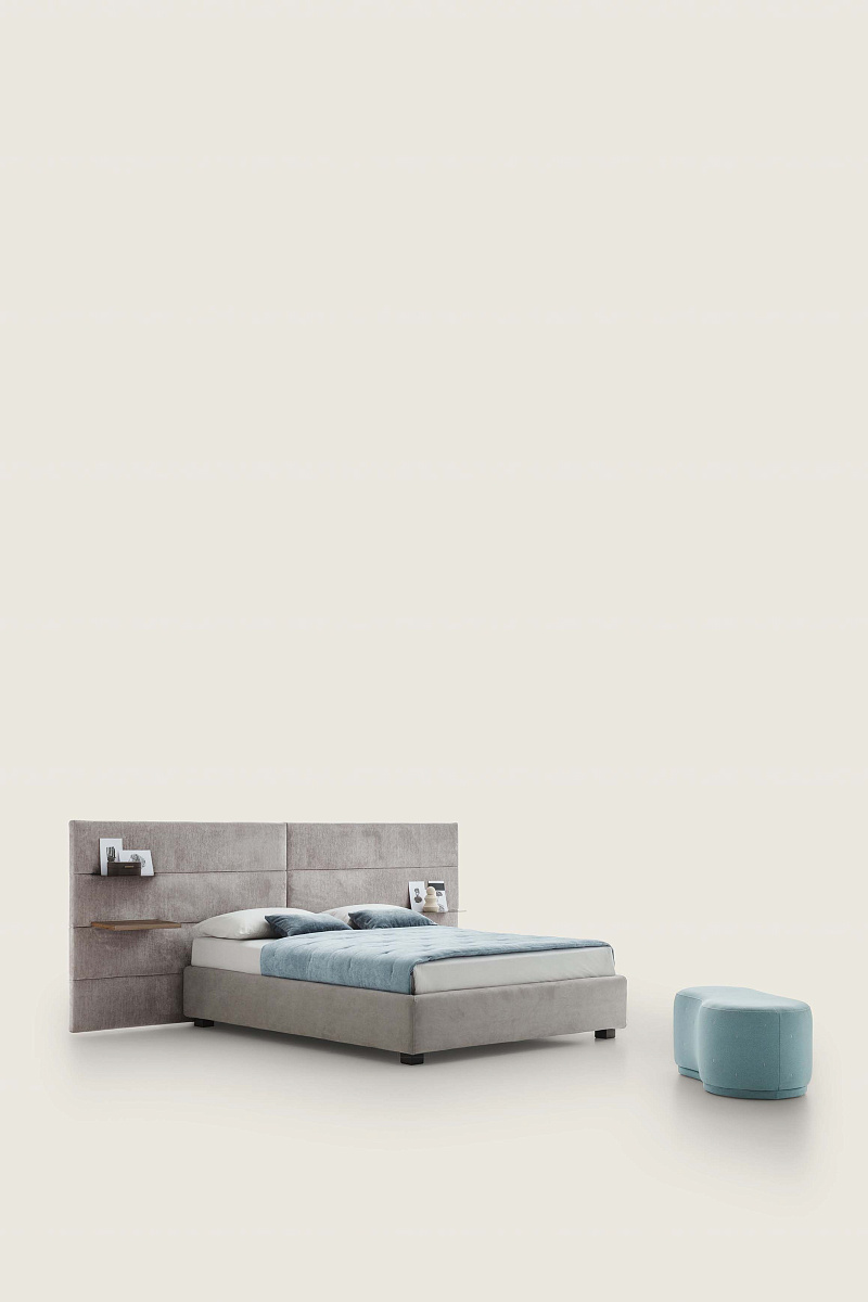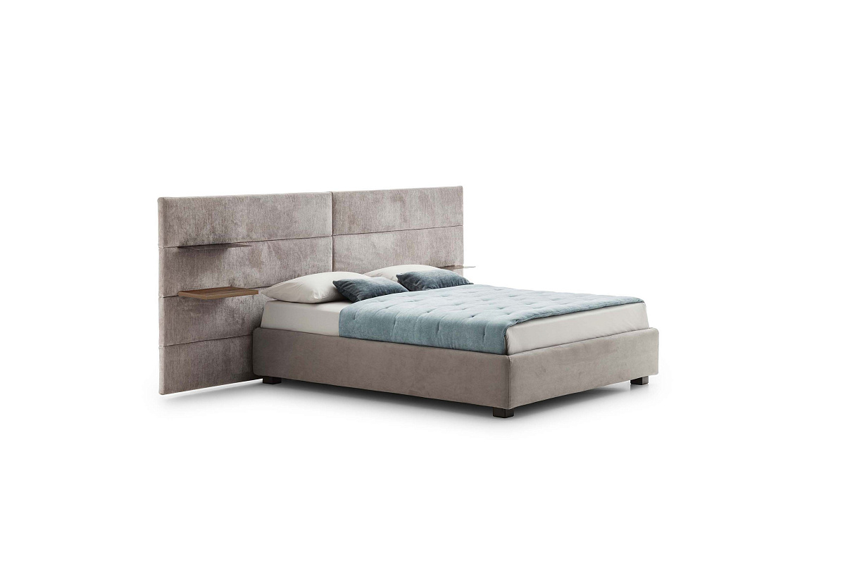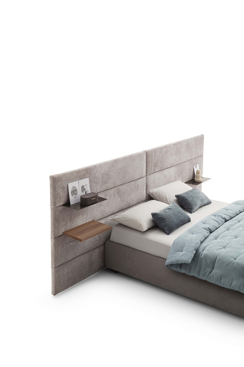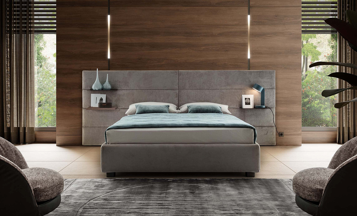 Кровать в стиле «контракт» с горизонтальным мягким изголовьем и боковыми полками.