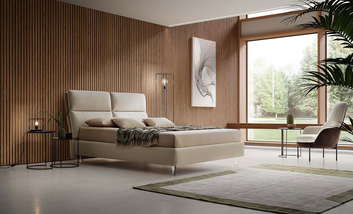 Современная кровать с широким изголовьем, состоящим из двух больших вертикальных подушек, разделенных посередине.
