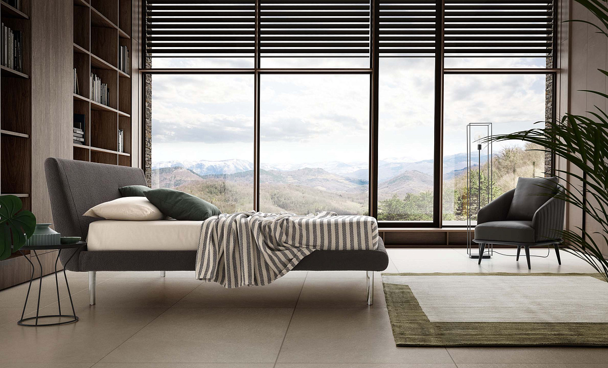 Кровать с простым, слегка наклонным мягким изголовьем и изящной боковой строчкой.