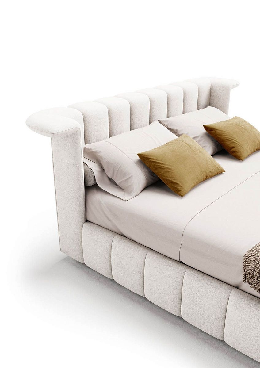 Люкс. Как следует из названия, перед нами кровать с извилистым профилем, напоминающая о сдержанной роскоши и элитарности. Главное место в ней занимает спинка, характеризующаяся вертикальными элементами, которые обтягиваются по отдельности перед сборкой, создавая чёткий, но при этом округлый визуальный ритм.