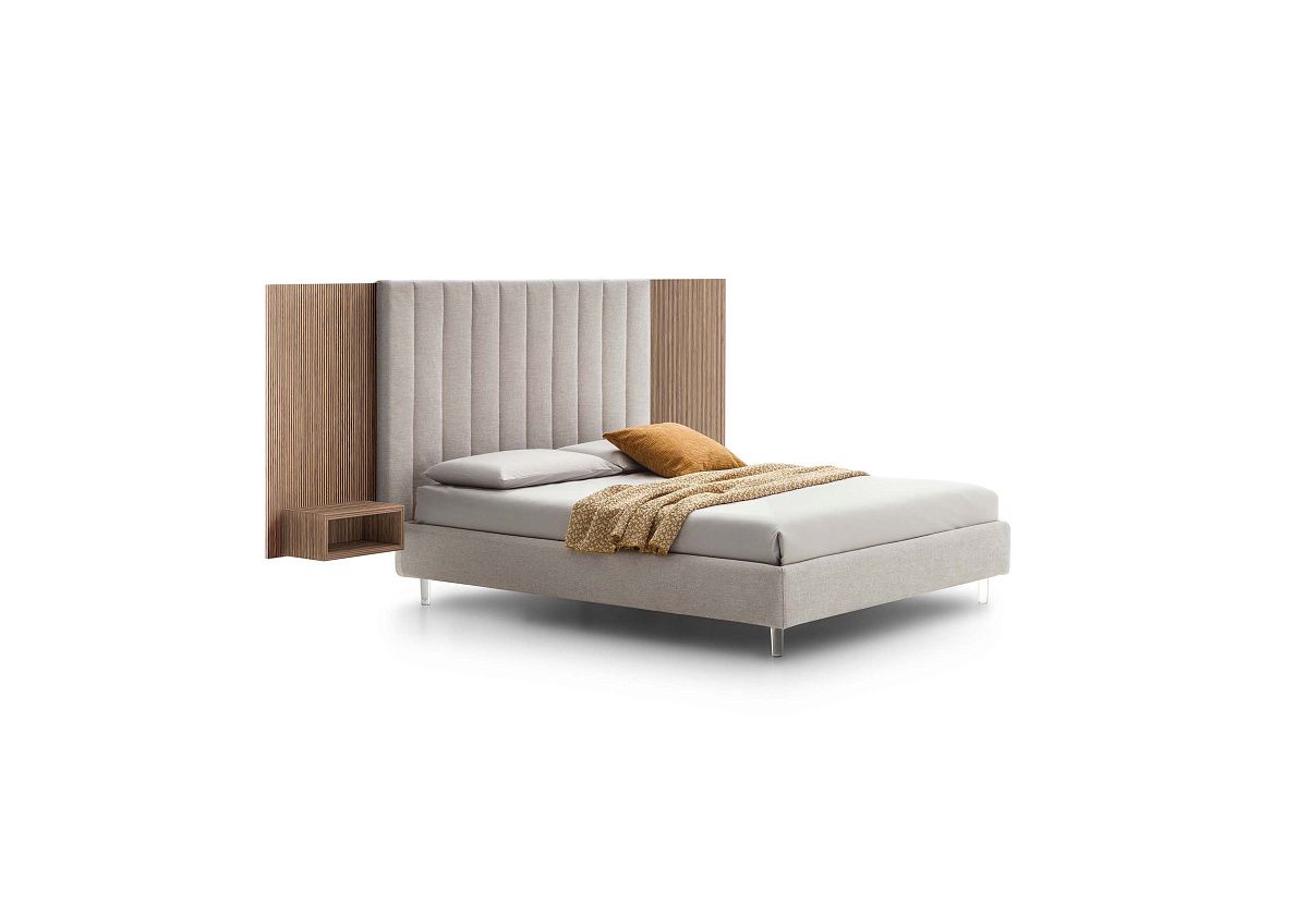 Кровать-конверт с вертикальным мягким изголовьем и боковыми панелями со встроенными полками.