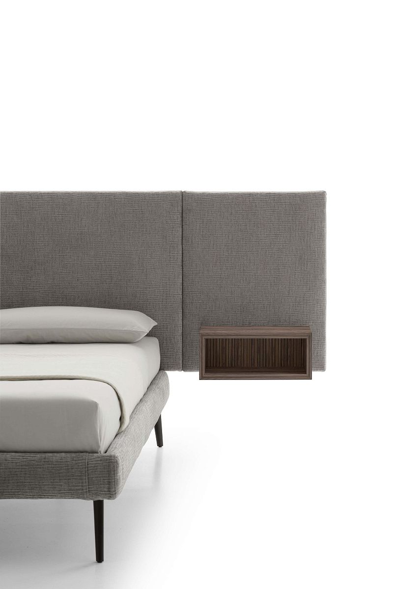Кровать в стиле «контракт» с простым гладким мягким изголовьем и боковыми полками.