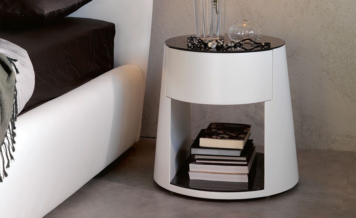 Круглая прикроватная тумбочка Nigel отличается лаконичным дизайном с футуристическим оттенком. Эта современная тумбочка имеет оригинальную коническую форму, которую подчёркивает ящик с закруглённой передней частью и, напротив, углубление под ним с квадратным основанием. Чтобы подчеркнуть структурную композицию, столешница и полка под ней могут сочетаться или контрастировать с боковинами.