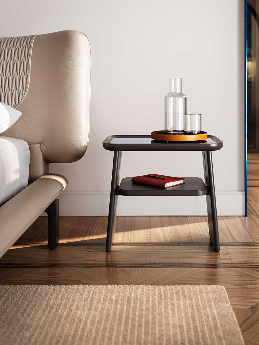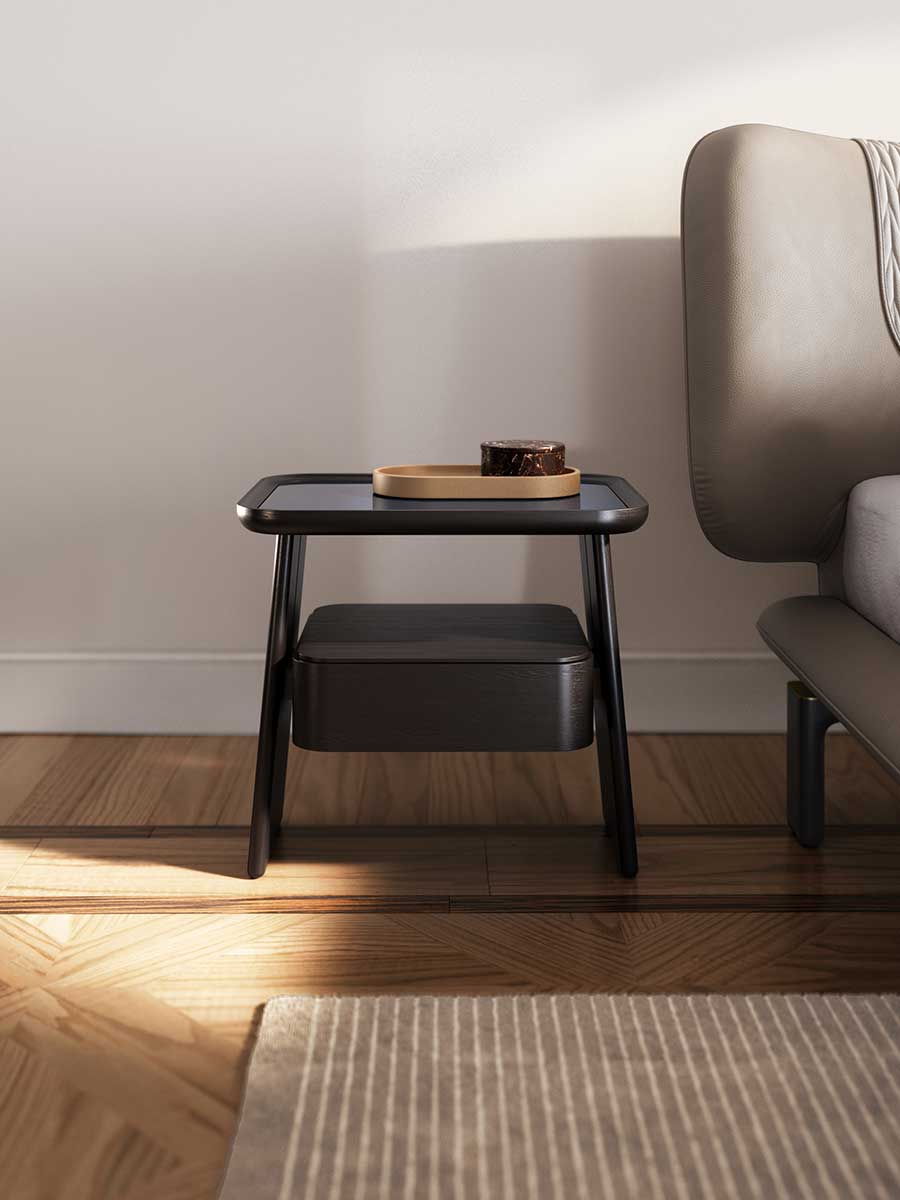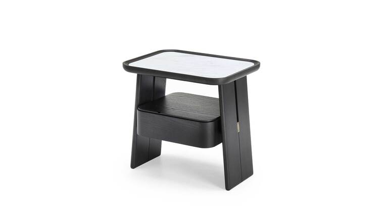 Прикроватная тумбочка DUO — дизайнерская модель с чистым, элегантным силуэтом. Каркас и полки из массива ясеня. Три конфигурации: с ящиком, полкой или перекладиной. Версия с ящиком имеет встроенную ручку на передней панели для легкого открывания и закрывания. Столешница доступна в различных вариантах отделки.