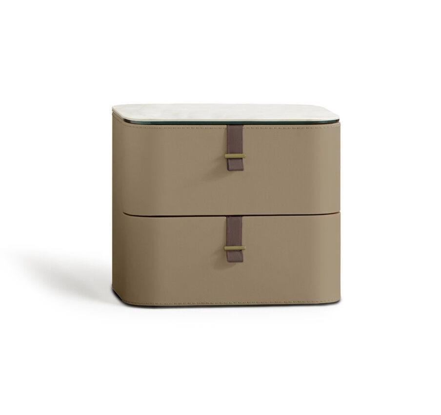 Модель Gregory Night представлена в двух вариантах: тумбочка с двумя ящиками и комод с тремя ящиками. Оба они отличаются мягкостью линий, закругленными углами и гармоничными пропорциями. Обе версии полностью обтянуты кожей и могут быть оформлены в соответствии с индивидуальными предпочтениями, благодаря чему они идеально впишутся в любую концепцию интерьера. На выбор предлагается керамическая или мраморная столешница, а также двухцветная комбинация.