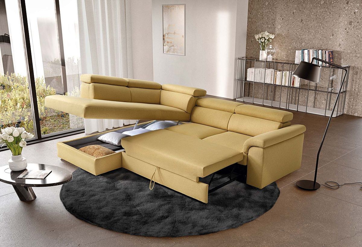 Классический диван с местом для хранения, регулируемыми подголовниками и выдвижными подставками для ног. Закругленные подлокотники.