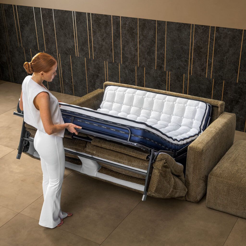 Раскладной диван-кровать с быстрораскладывающимся механизмом,в комплекте с матрасом высотой 17 см из недеформируемого пенополиуретана сосбалансированной поддержкой.