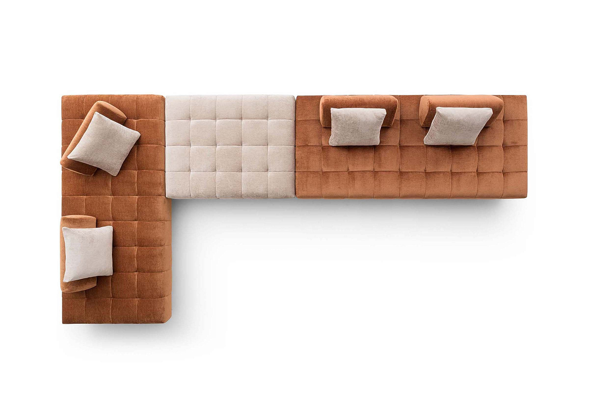 Стеганый модульный диван с высокими ножками и плавно выдвижными спинками.