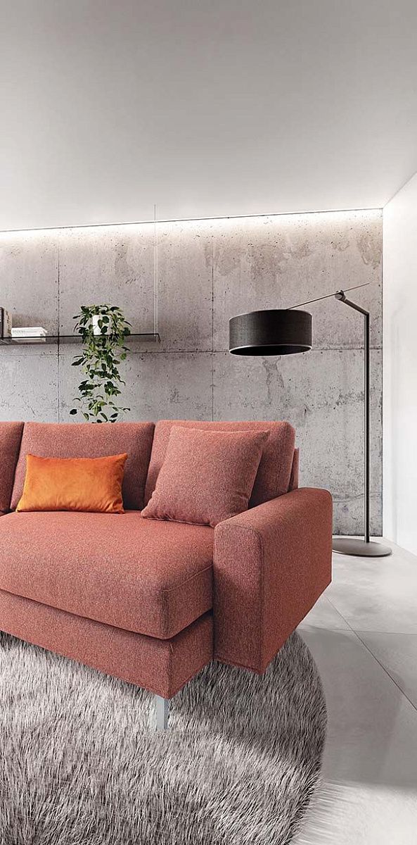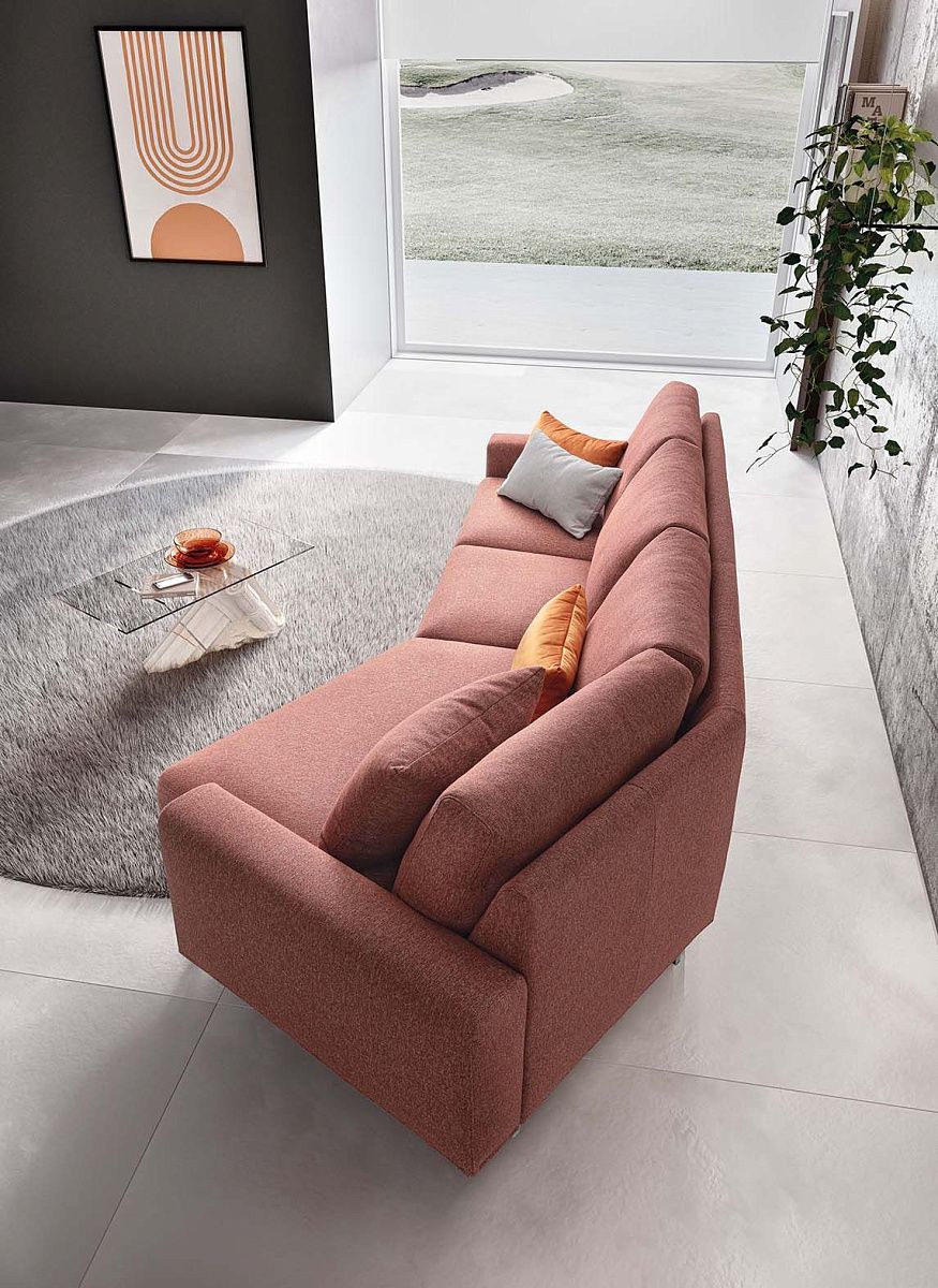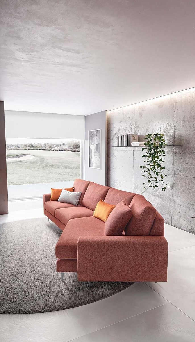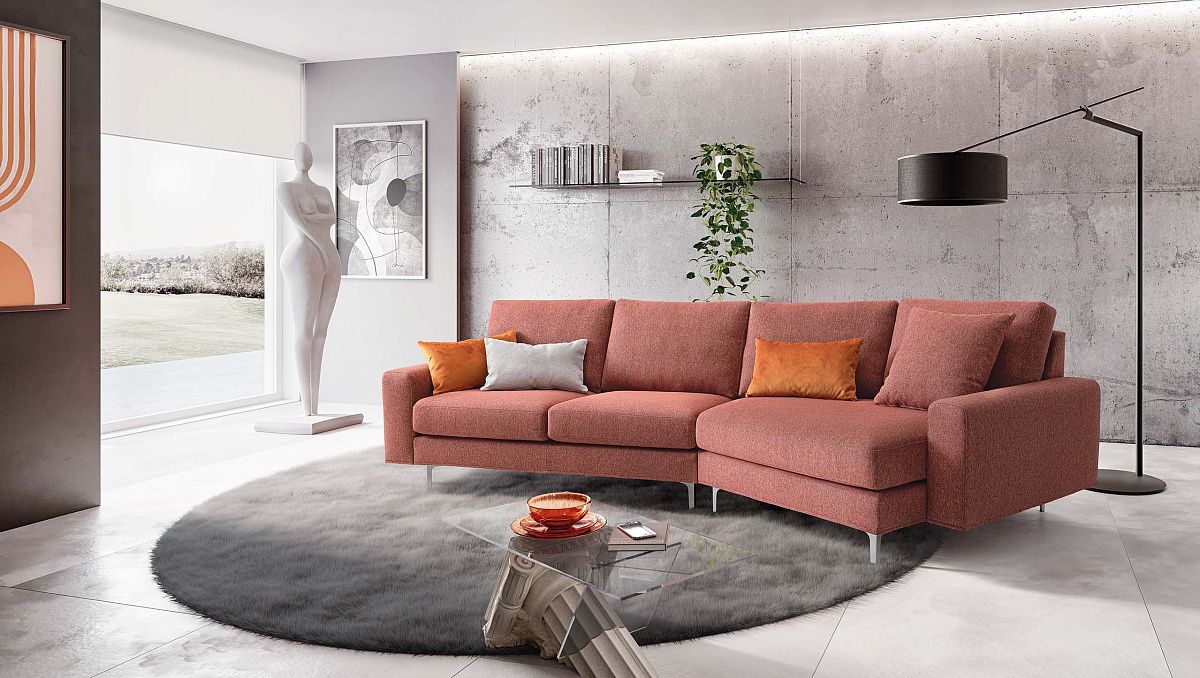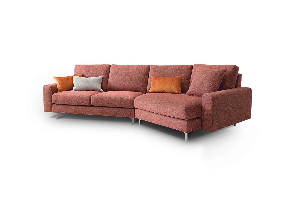 Диван с выдвижной подставкой для ног, асимметричным угловым сиденьем и квадратными подлокотниками.