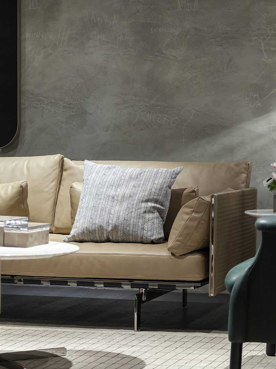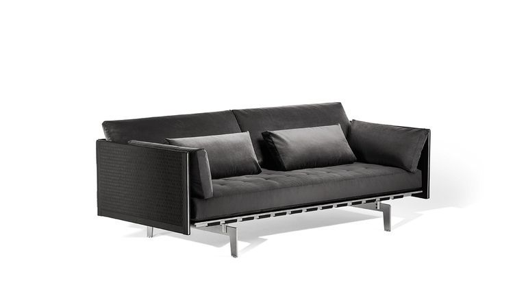 Диван Clayton с подушками сиденья, украшенными Х-образной ручной строчкой контрастной нитью. Пружины сиденья поддерживаются эластичными ремнями из кожи ручной работы. Обивка доступна из кожи Pelle Frau® или ткани, возможны комбинации кожи и ткани.