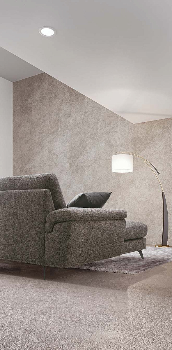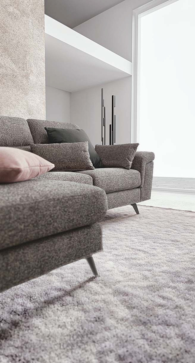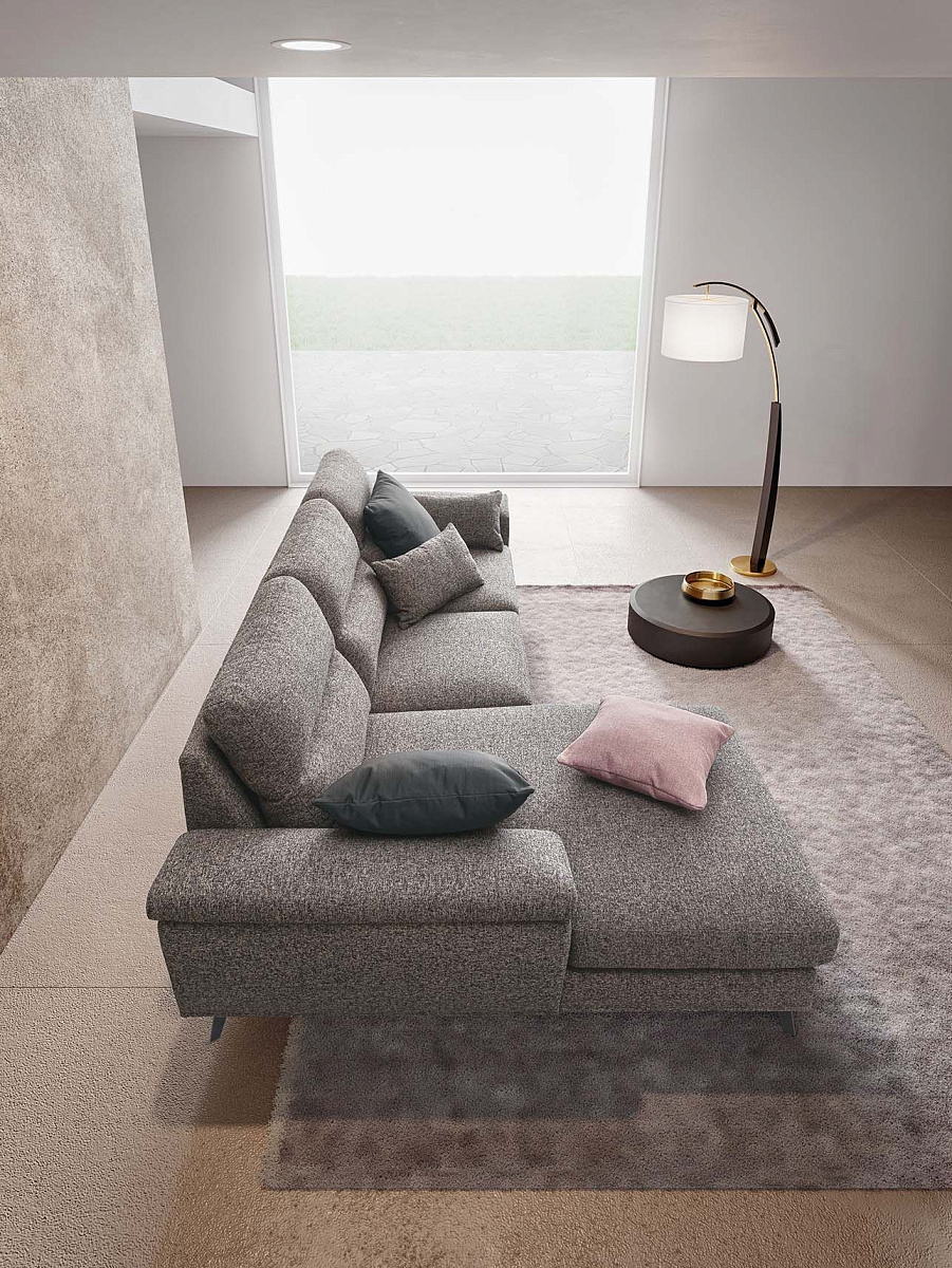 Диван с выдвижной подставкой для ног, асимметричным угловым сиденьем и закругленными подлокотниками.