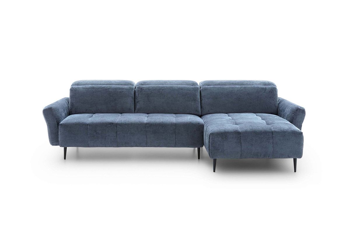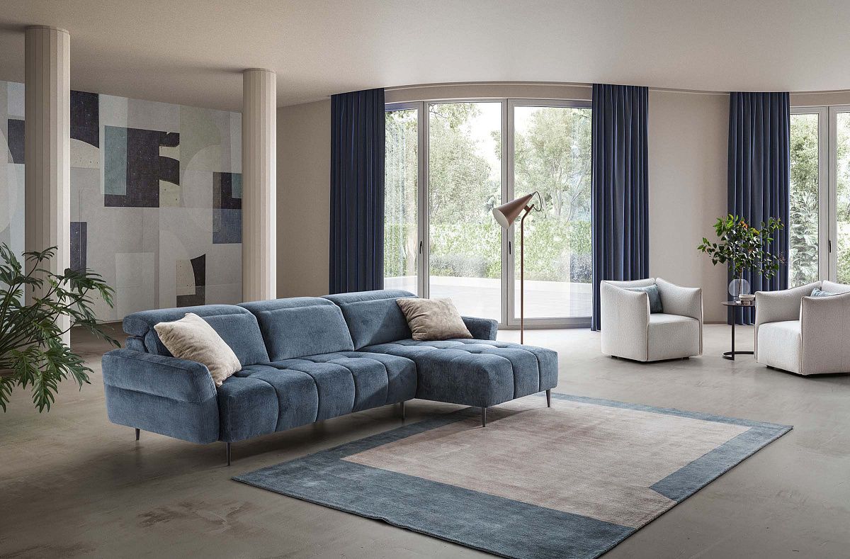 Модульный диван с округлыми формами, регулируемыми подголовниками и кушеткой.