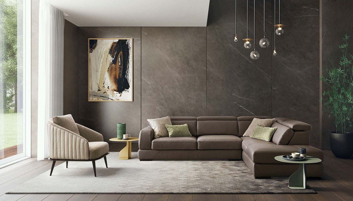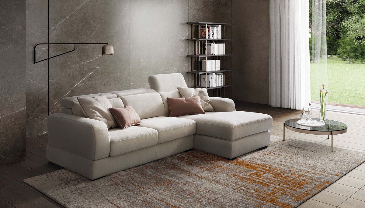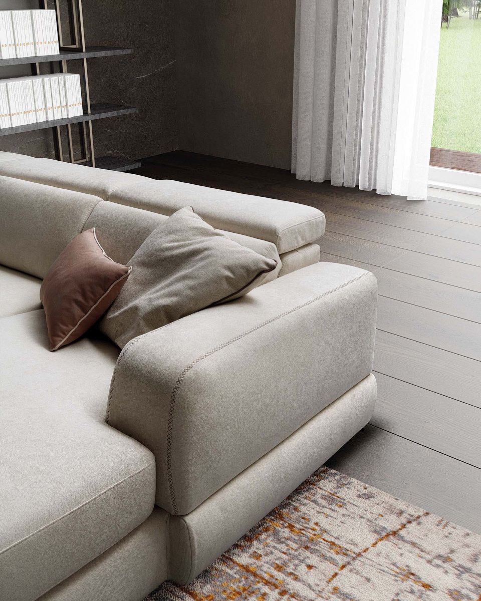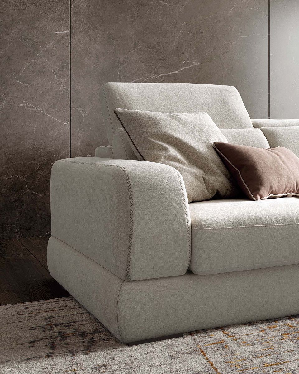 Элегантный диван с выдвижными сиденьями, регулируемыми подголовниками и видимой строчкой.