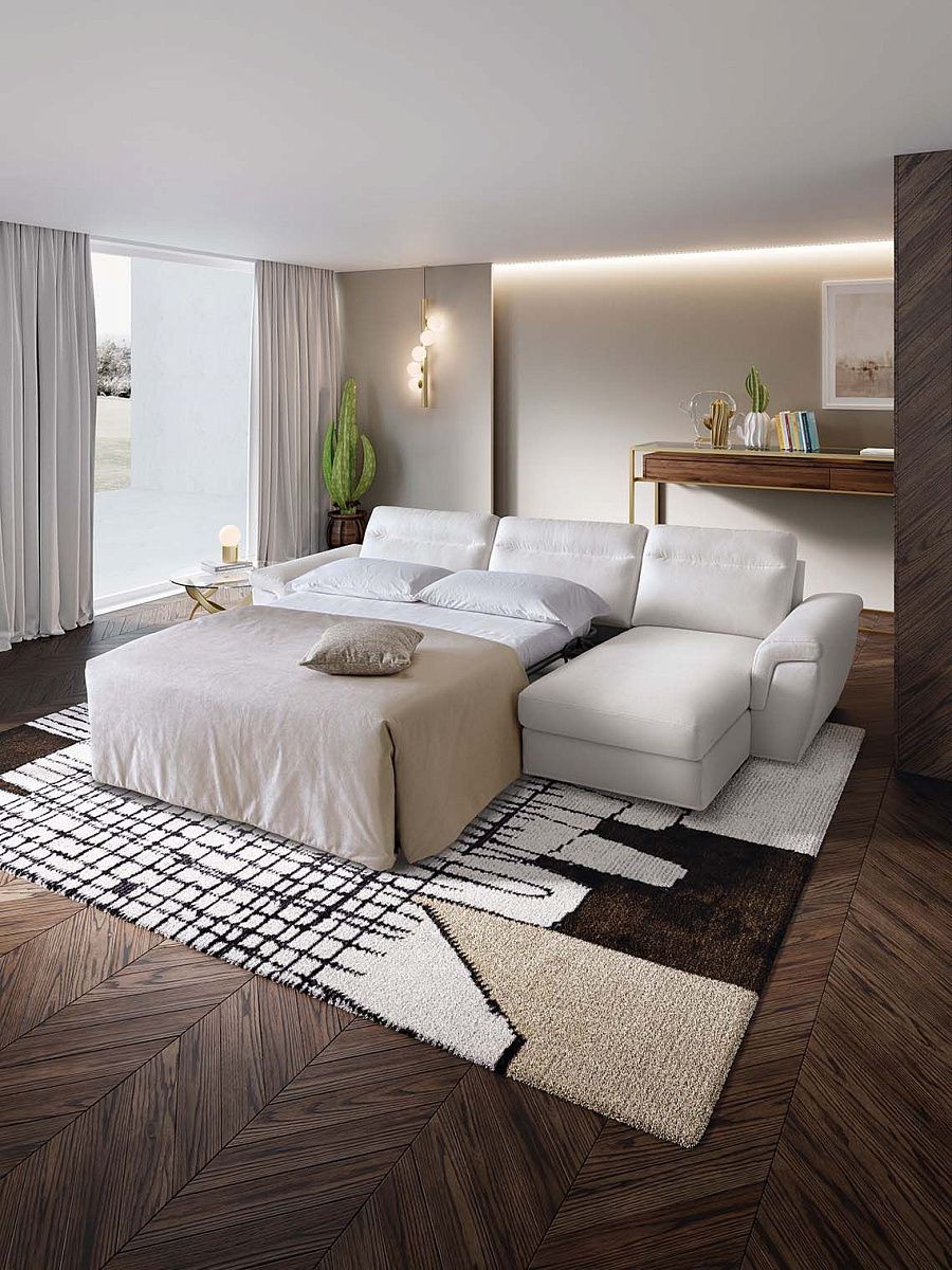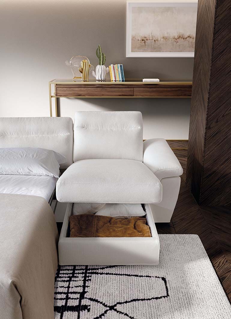 Диван мягкой формы с местом для хранения и механизмом для кровати, с возможностью регулировки высоты спинки.