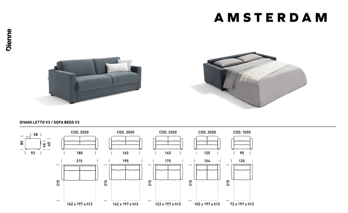 В базовой комплектации к дивану Amsterdam поставляется беспружинный матрас Standard на основе полиуретановой плиты. Под заказ, из Италии можно приобрести еще более комфортную деревянную решетку для спального места и различные варианты матраса, например с пружинами или со слоем Memory.