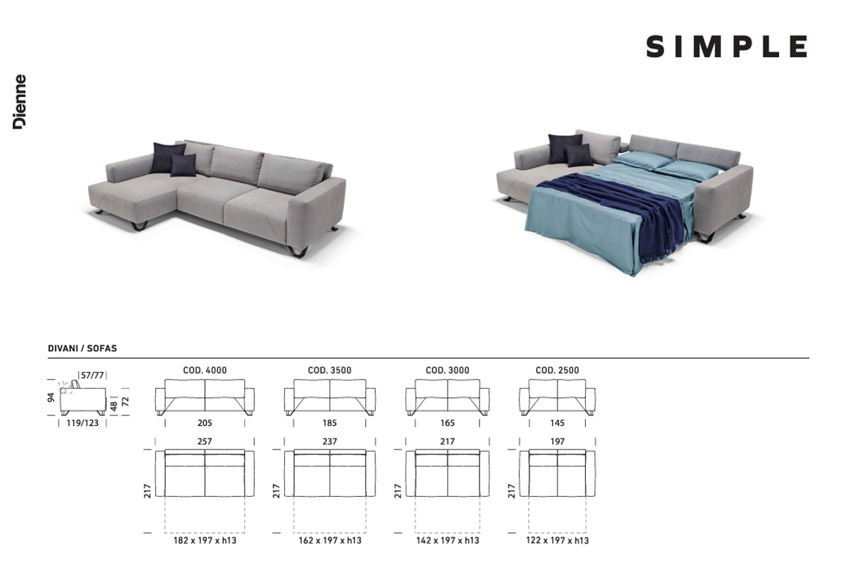 Диван-кровать Simple от итальянской фабрики Dienne — стильное и функциональное решение для современного интерьера. Simple раскладывается в полноценное спальное место с регулируемой спинкой и возможностью выбора глубины сиденья. Обивка — съемная ткань, наполнение — комфортный полиуретановый матрас (13 см) с эффектом памяти и гусиным пухом в плечевой зоне. Итальянский механизм, металлические ножки и прочная конструкция из массива дерева обеспечивают долговечность. В комплекте — две декоративные подушки 40×40 см. Доступны разные размеры и варианты матрасов (Standart / Memory Foam).