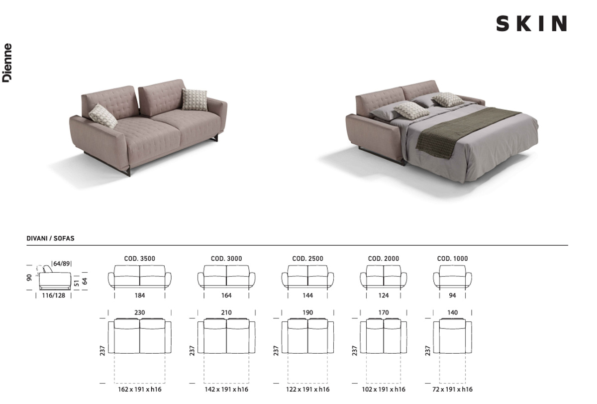 Диван-кровать Skin от итальянского бренда Dienne Salotti, известного своим 100% итальянским мастерством, высококачественными материалами и акцентом на функциональность для ежедневного использования. Диван-кровать Skin отличается современным дизайном, прочным каркасом из металла и дерева, доступен в различных размерах и отделках, с полностью съемным тканевым чехлом и удобной плотной набивкой сиденья и матраса.