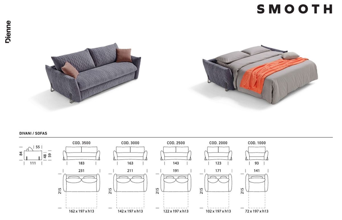 Диван-кровать Smooth от итальянского производителя мебели Dienne Salotti, который специализируется на диванах-кроватях-трансформерах, предназначенных для ежедневного использования. Ключевые особенности включают прочный металлический каркас, возможность выбора матраса с сварной сеткой или реечным основанием, полностью съёмные тканевые чехлы для удобства ухода и стальные ножки. Диван-кровать Dienne Smooth доступен с различными вариантами обивки и спроектирован для удобства сборки, разборки и транспортировки.
