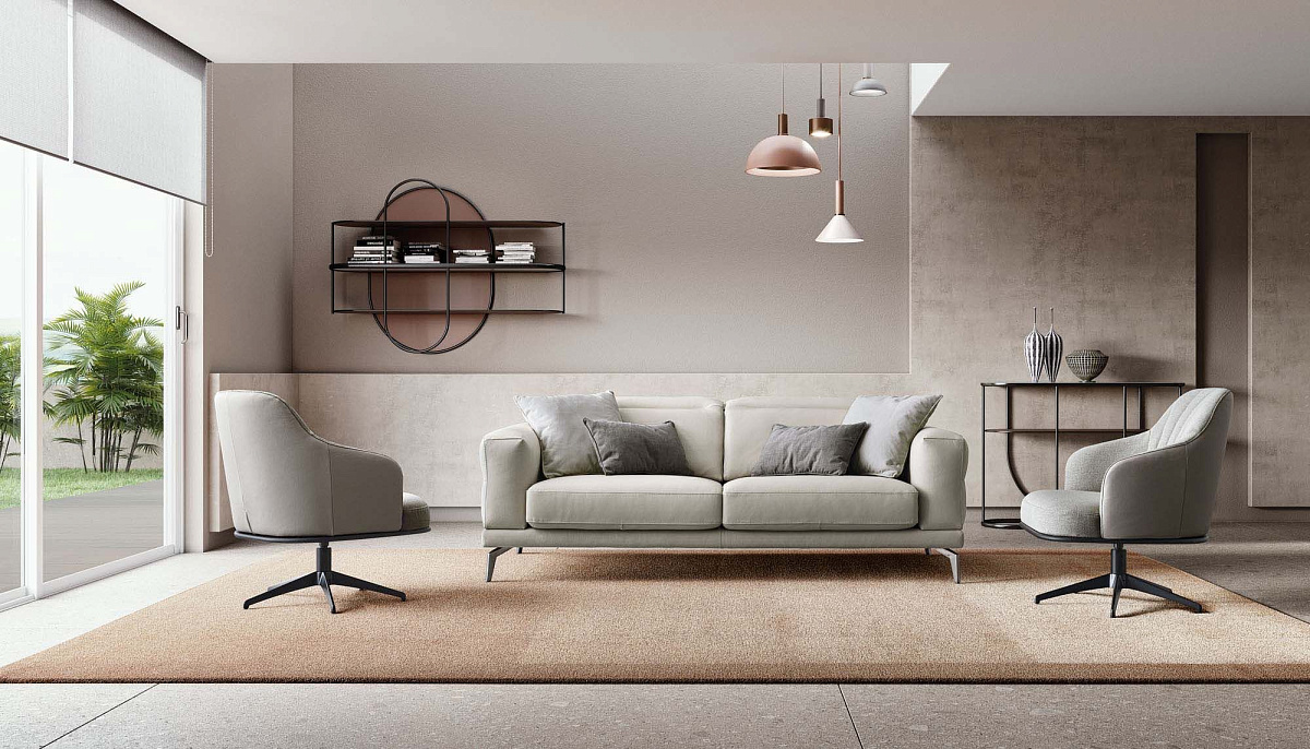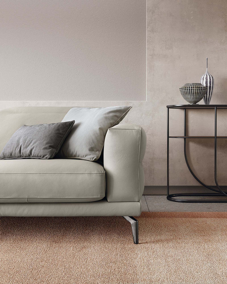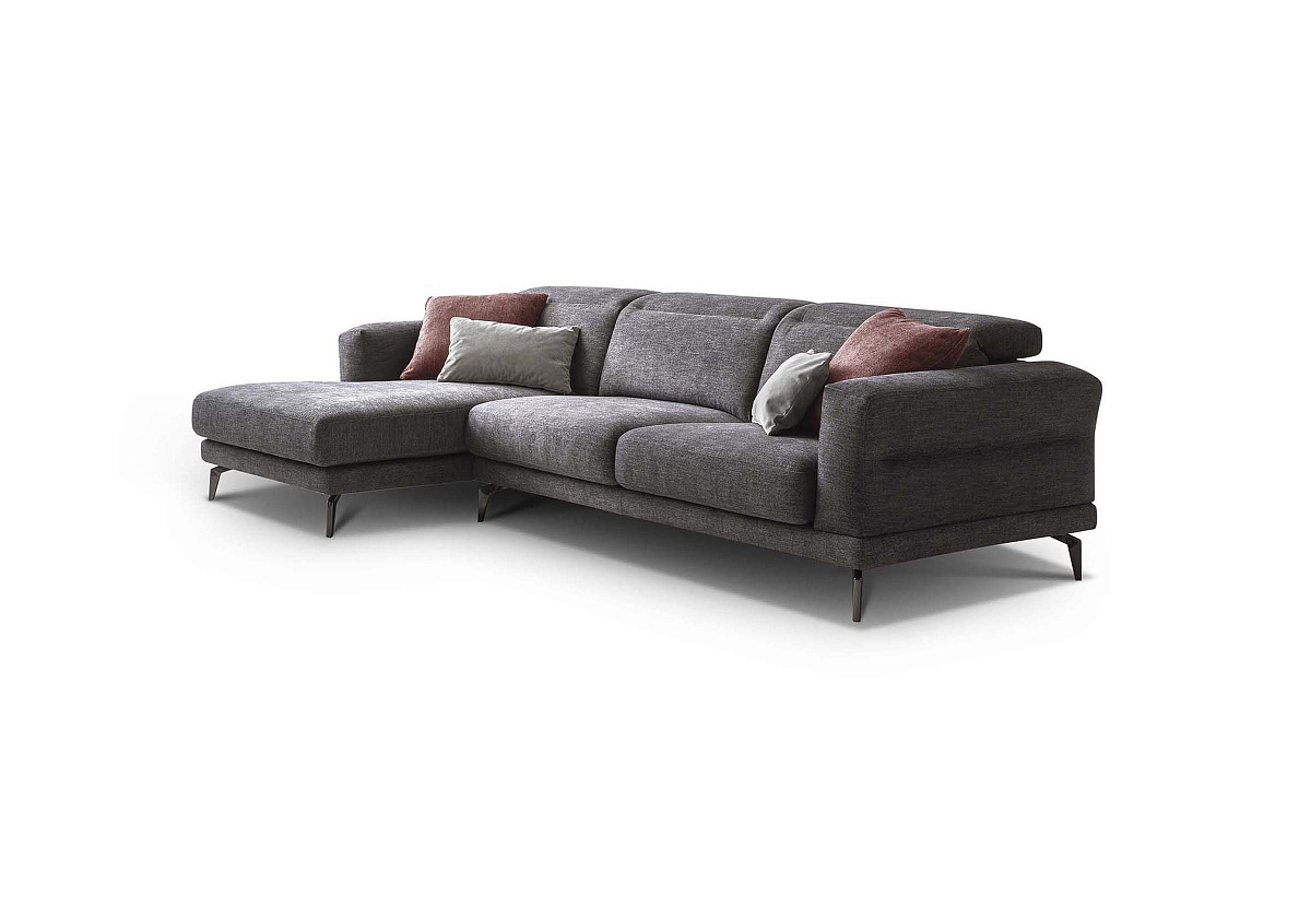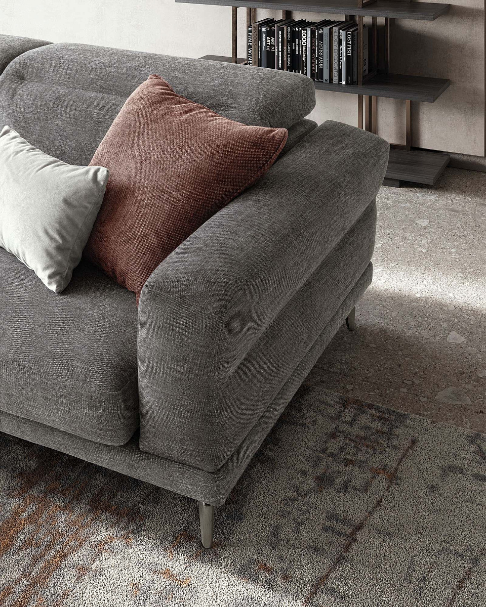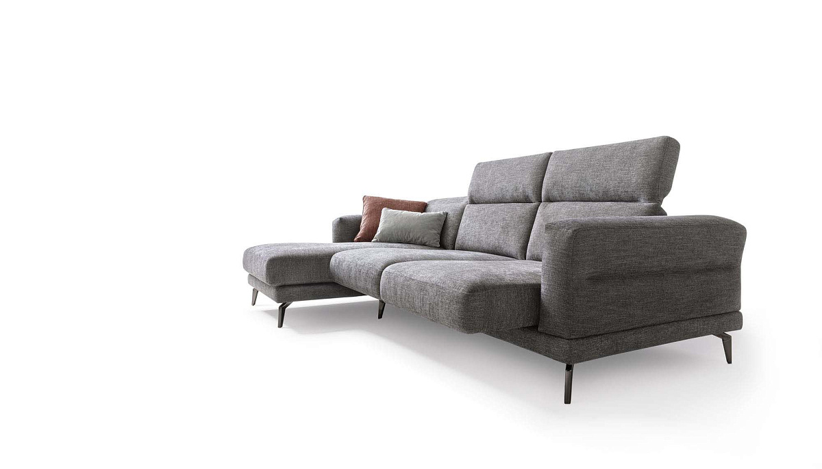 Современный диван с выдвижными сиденьями, регулируемыми подголовниками и приподнятыми бортиками.