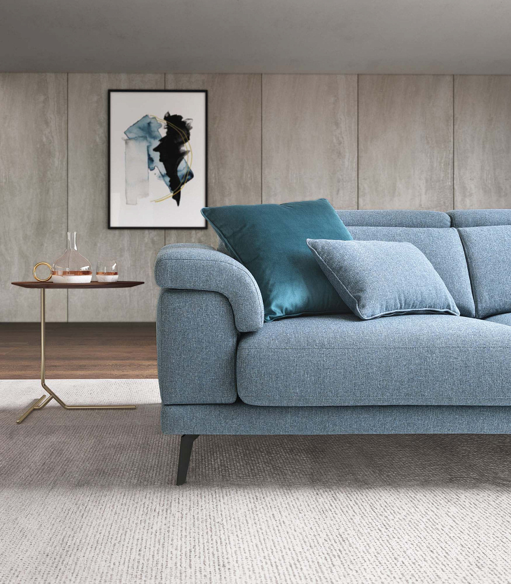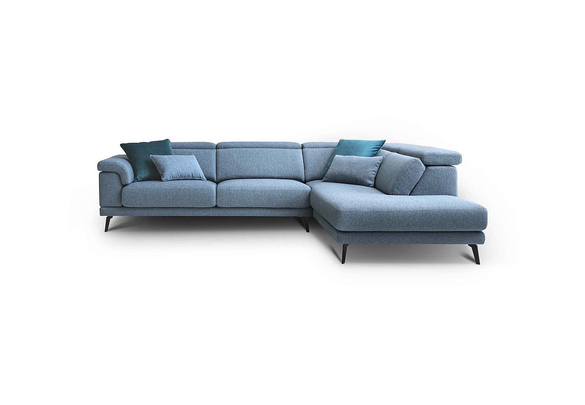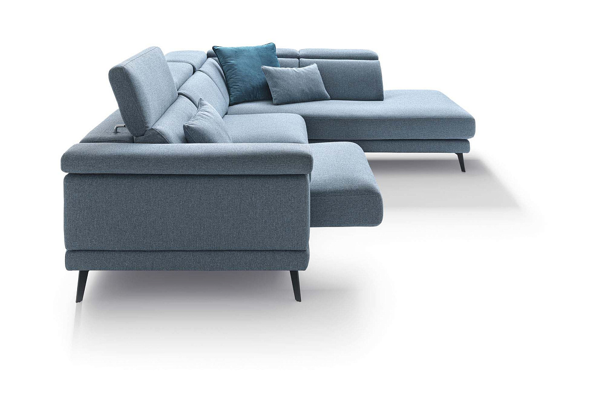 Современный диван с выдвижными сиденьями, регулируемыми подголовниками и декоративными бортиками.