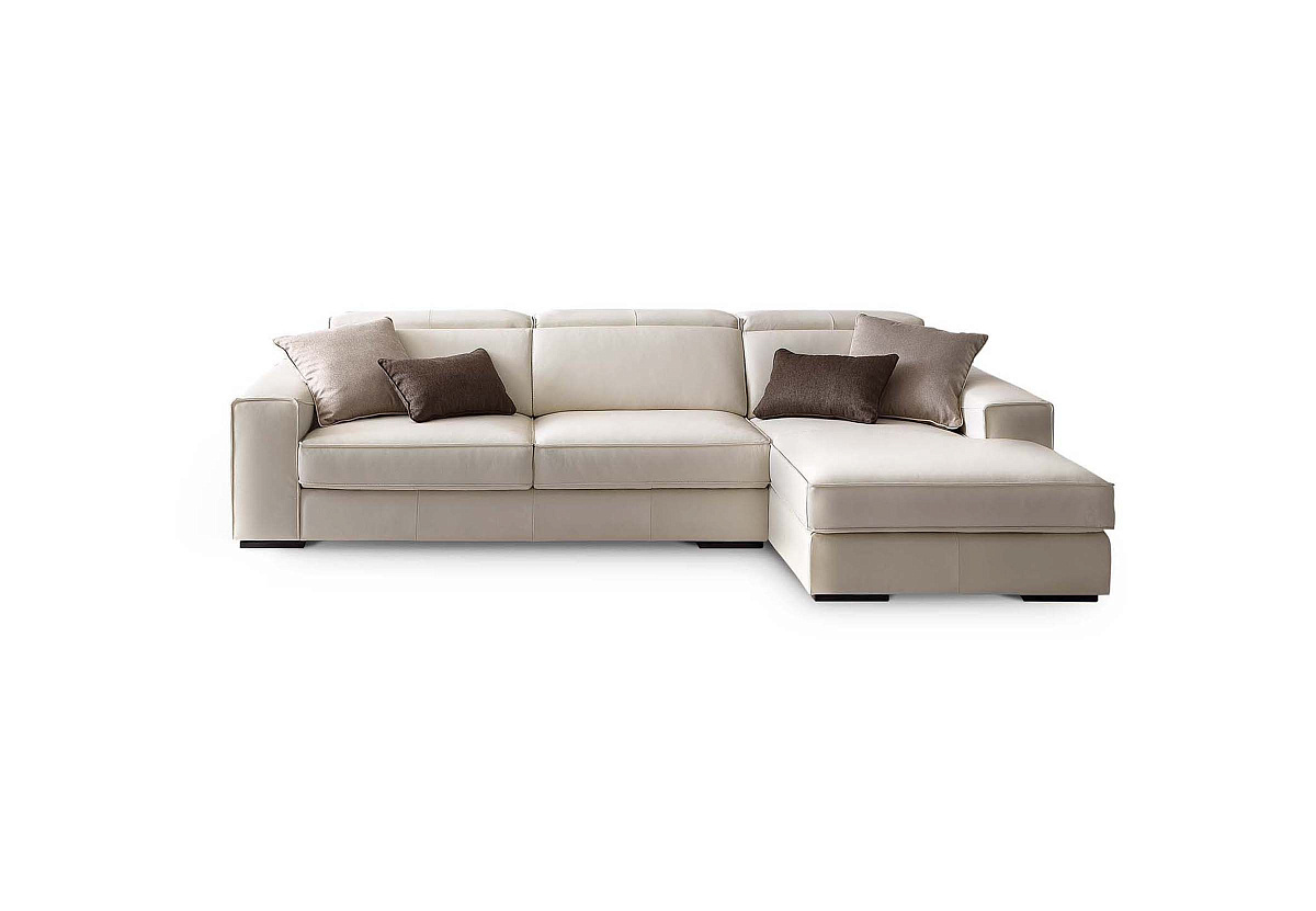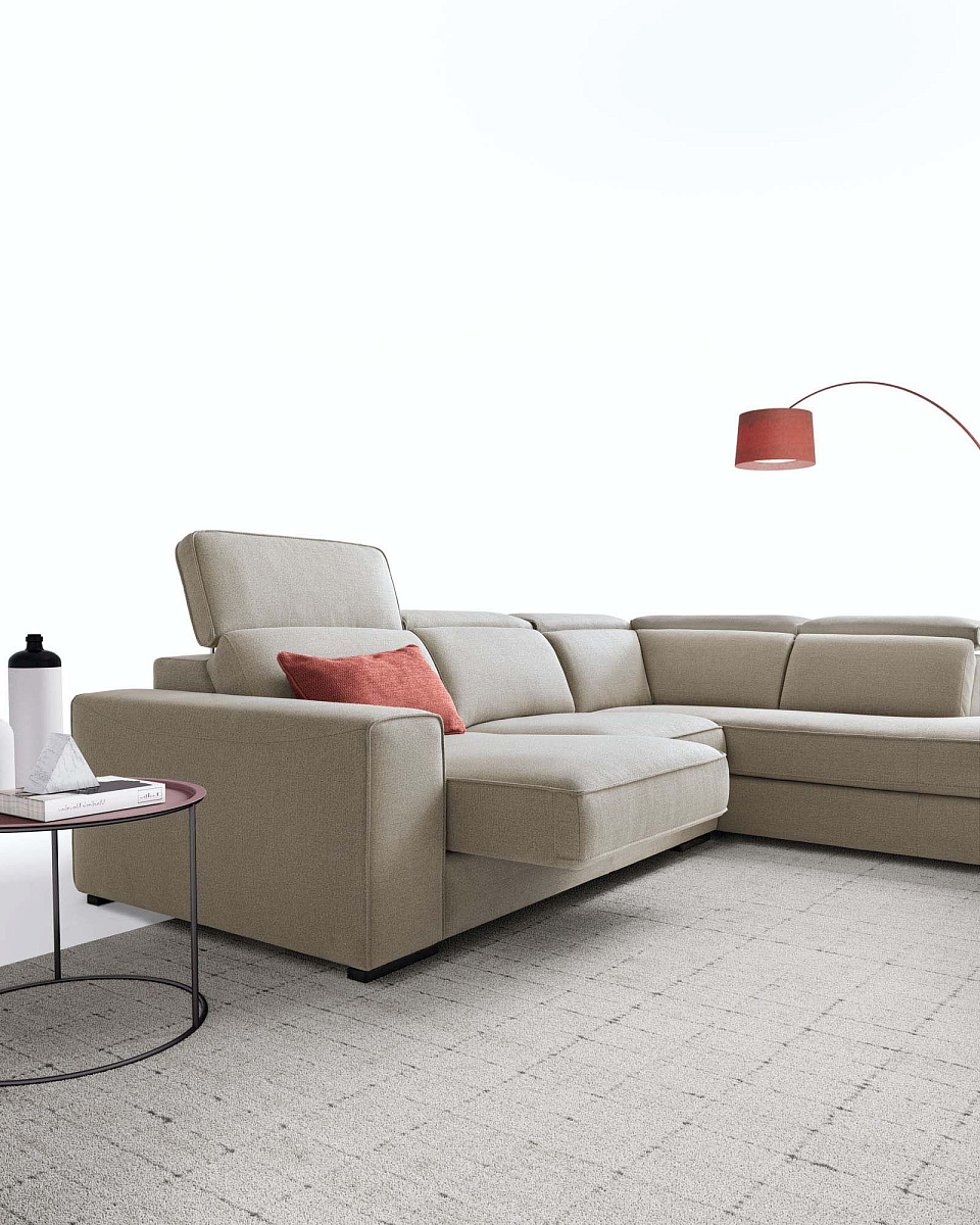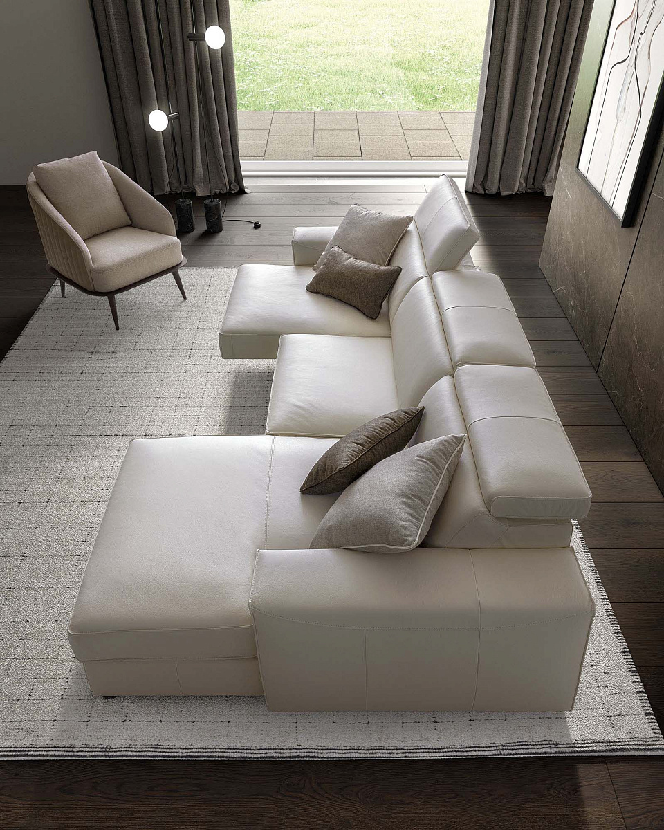 Диван с выдвижными сиденьями, регулируемыми подголовниками и выдвижной подставкой для ног с приподнятыми бортиками.