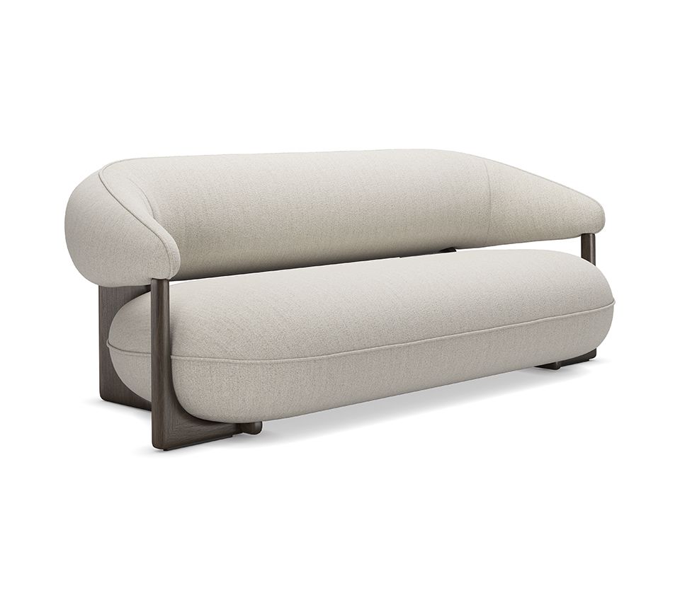 Очень большое сиденье украшено наружной строчкой и венчается спинкой, которая нежно обнимает корпус, превращаясь в подлокотник. Выбор дерева для изготовления каркаса имеет символическое значение, так как это - ценный и прочный материал, способный создать эффект кокона, вмещая в себя подушки с мягкой набивкой.