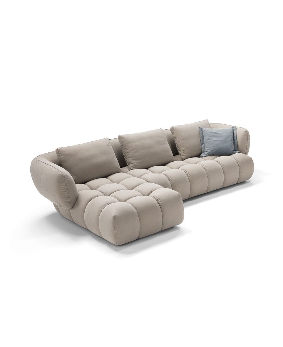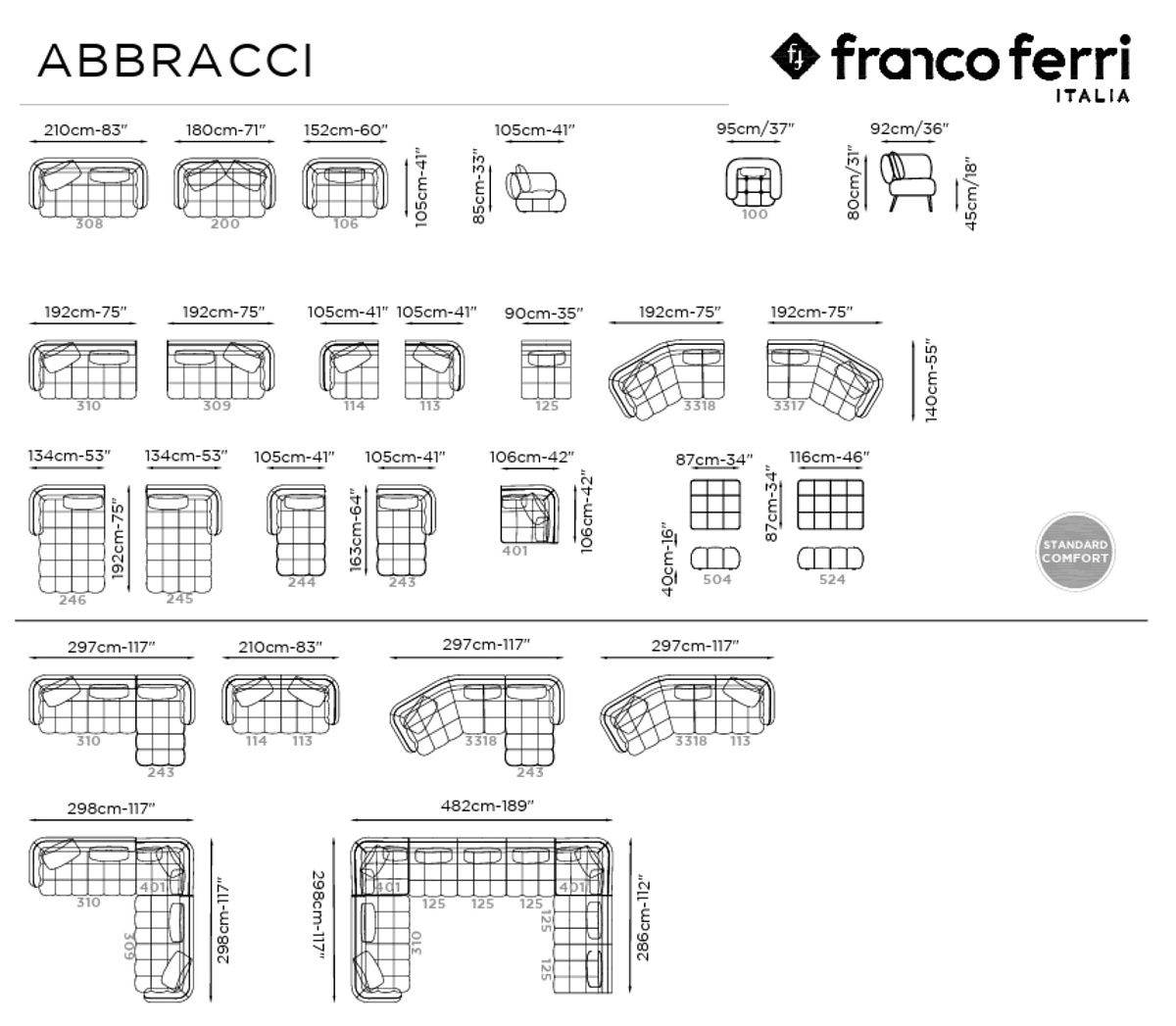 Мягкие линии дивана Abbracci , подчеркнутые мастерством исполнения благодаря богатой геометрической стежке, повторяющей силуэт сиденья, создавая современную эстетику, где строчки формируют объёмы и прорисовывают смелые, ритмичные линии. Мягкая спинка с обивкой плавно переходит в подлокотники, обеспечивая дополнительный комфорт. Модульная конструкция включает в себя прямые диваны, угловые диваны и шезлонги.