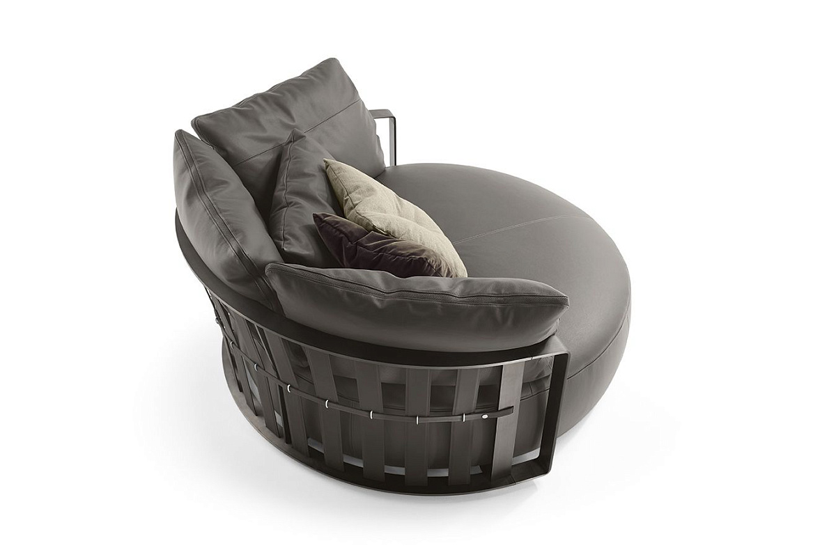 Диван Scarlett окружён стальным кольцом, поддерживающим ремни из седельной кожи. Подушки сиденья и спинки наполнены гусиным пухом и пенополиуретаном. Обивка выполнена из ткани или кожи Pelle Frau®.