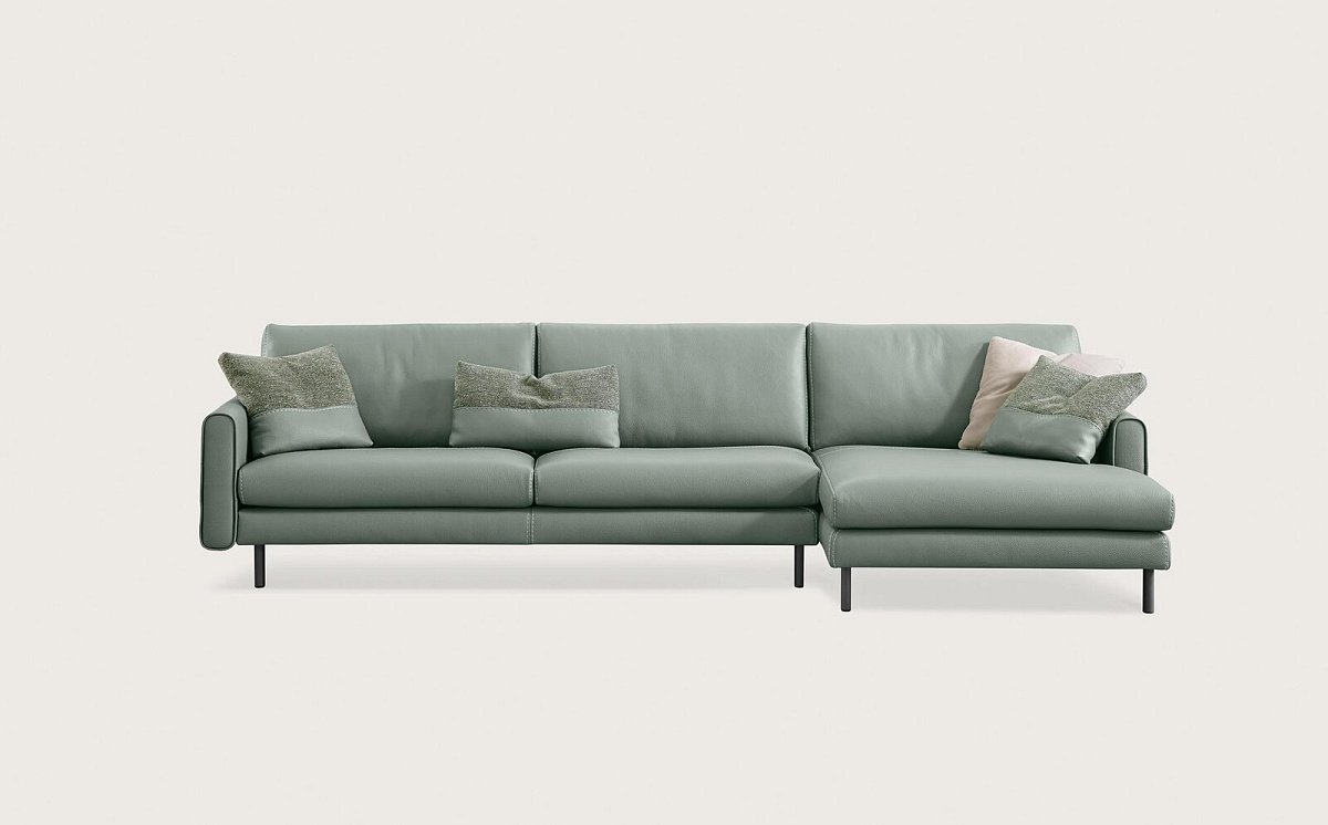 Легкий подлокотник с изящными строчками. Облегченное основание с металлическими ножками словно приподнимает диван над полом и придает ему воздушный и элегантный вид.