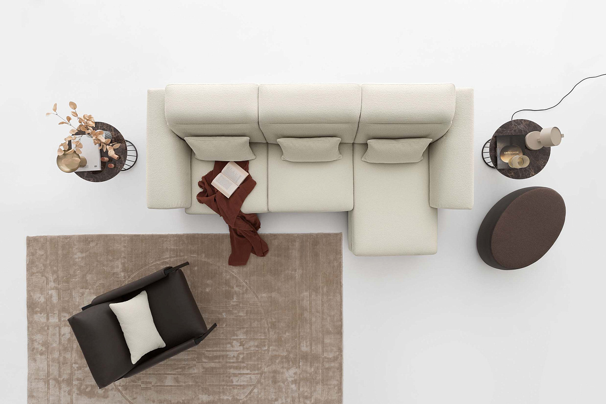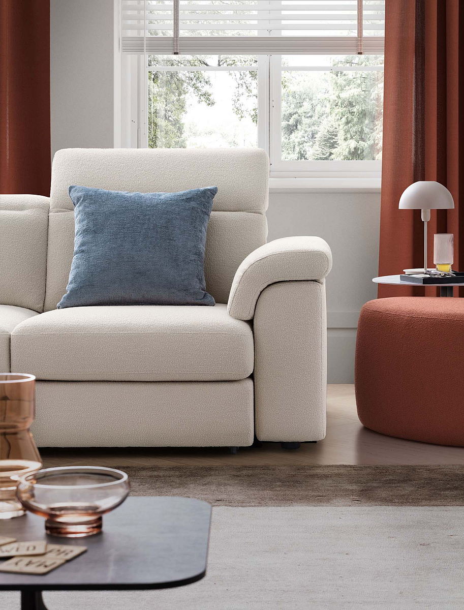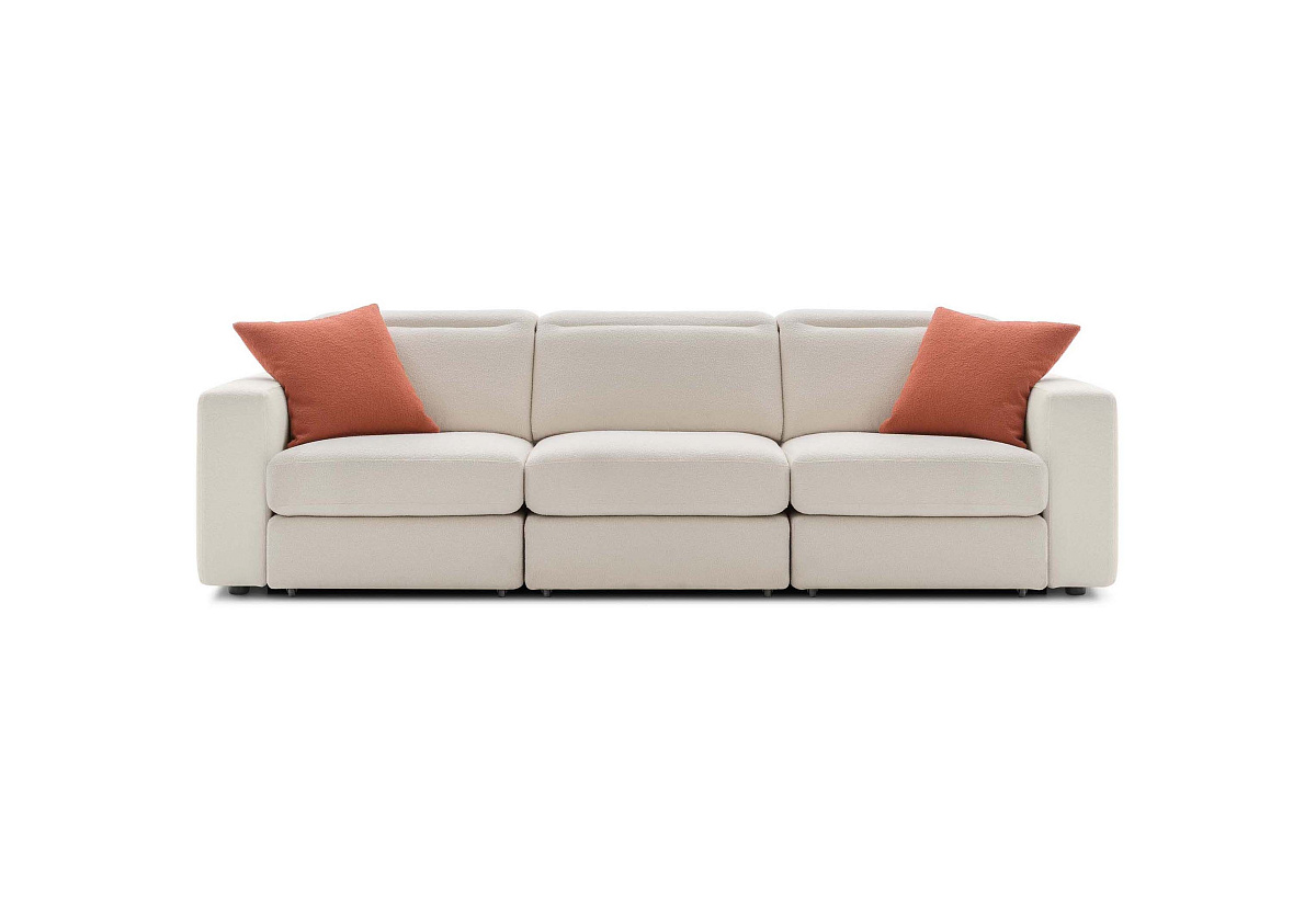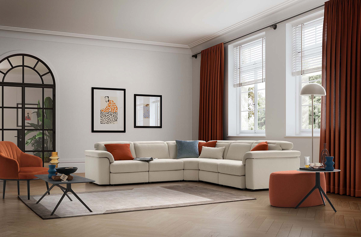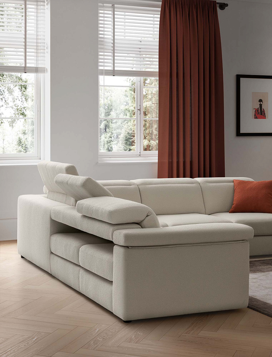Диван криволинейного дизайна с выдвижными сиденьями, регулируемыми подголовниками и регулируемыми подлокотниками.