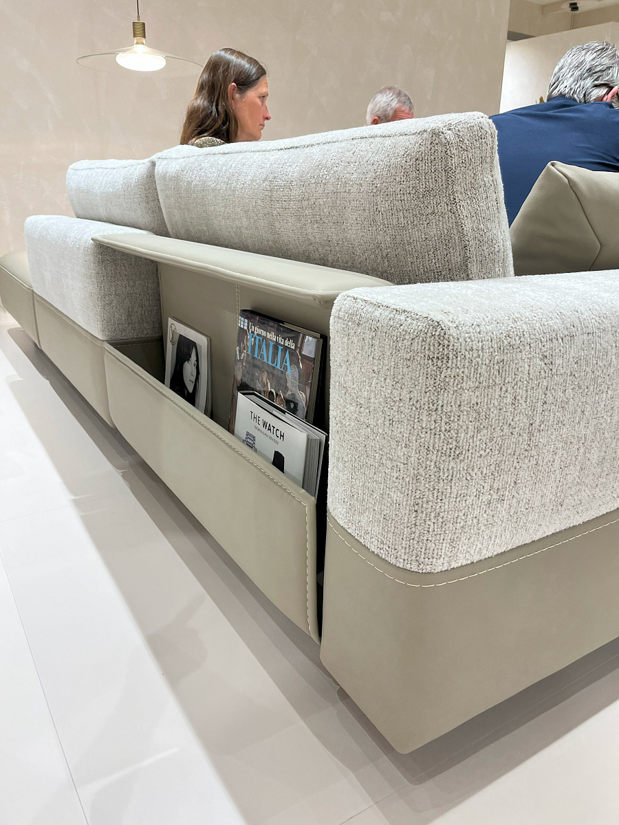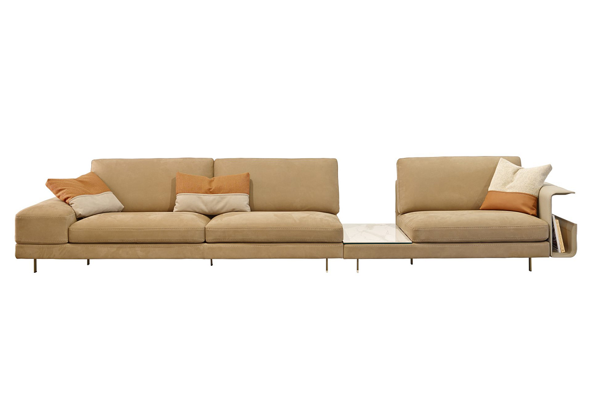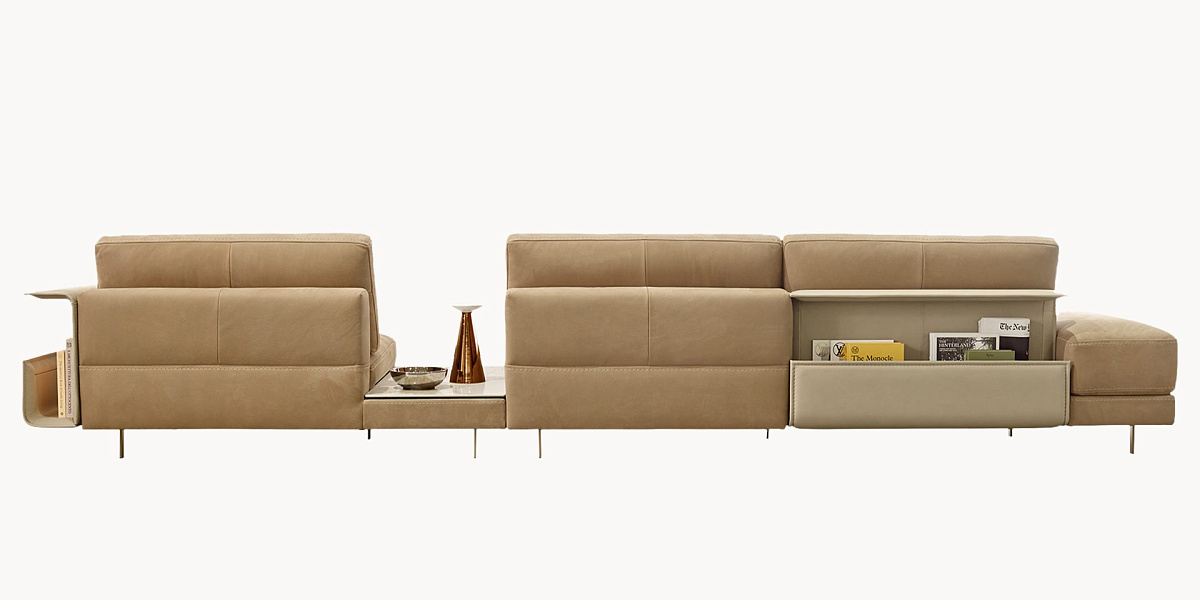Секционный кожаный диван, сочетающий в себе дизайн и функциональность благодаря изысканным линиям и потрясающими аксессуарам.