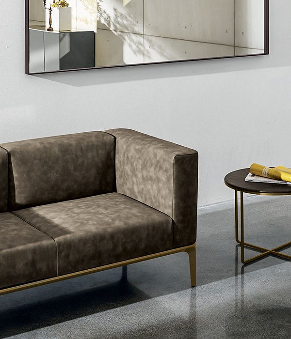 Модульный и персонализируемый диван с литыми алюминиевыми ножками, полированным хромированным покрытием или лакированным, различные варианты отделки. Алюминиевый профиль каркаса, анодированный или лакированный, различные варианты отделки. Сиденье и подлокотники с мягкой обивкой и обивкой из различных материалов и с различными вариантами отделки.