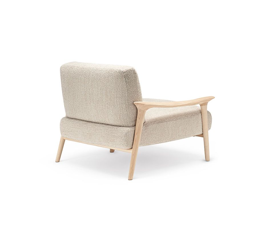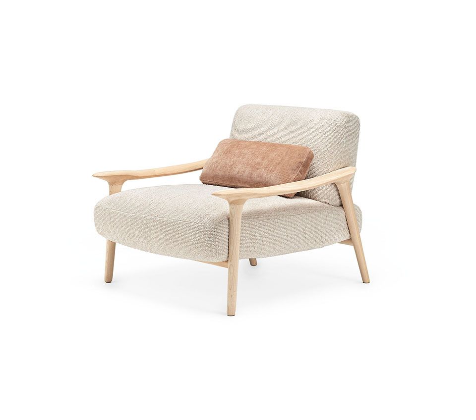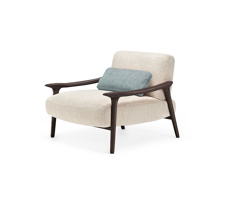 Версия для гостиной Giselle Lounge, напротив, является мастерским выражением легкости и технического мастерства. Это низкое кресло с деревянными подлокотниками обязано своим очарованием кажущемуся отсутствию поддержки мягкой спинки. Большие подушки, образующие сиденье и спинку, кажутся естественными и не имеющими структуру.