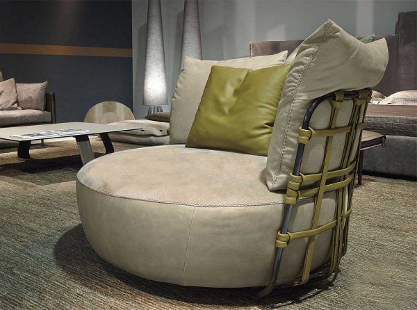 Вращающееся кресло украшено кожаными лентами, завязанными и накрученными на легкий трубчатый профиль. Спинка с тремя подушками задумана для того, чтобы тепло «обнимать» сидящего. Кресло Love может быть персонализировано за счет красочных сочетаний расцветок и отделки, доступных в этой коллекции.