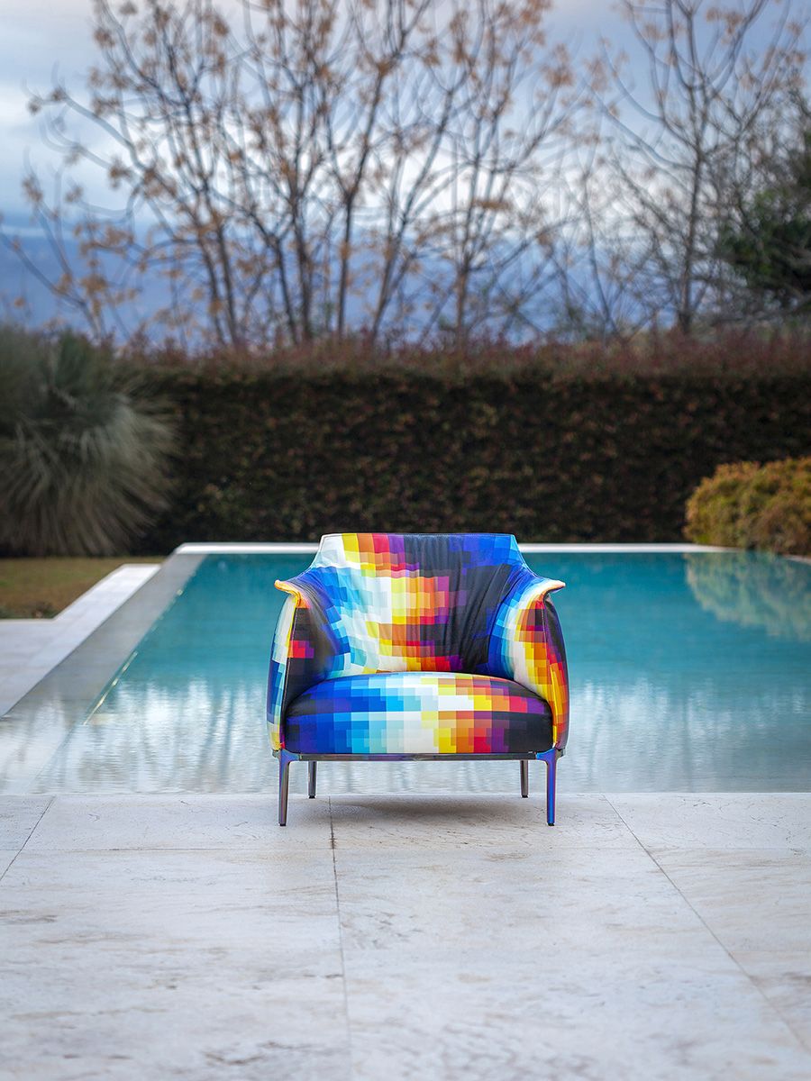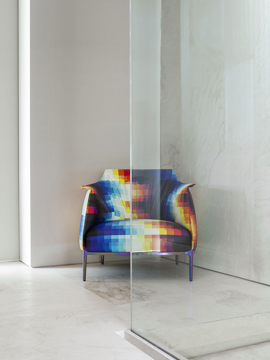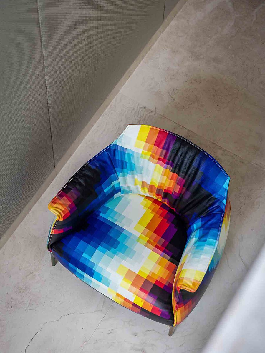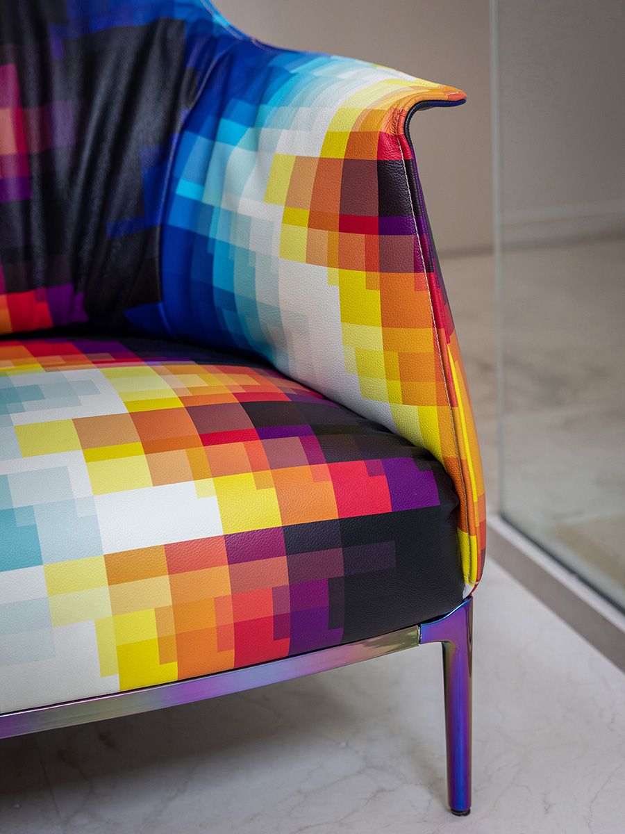Кресло Archibald, разработанное Жаном-Мари Массо, представляет собой широкое и глубокое кресло со стальным каркасом, наполненное формованным пенополиуретаном и полиэстерной ватой для большего комфорта. Оно отличается приятной текстурой кожаной обивки и откидными подлокотниками, напоминающими воротник рубашки. Благодаря цифровой печати на коже, обычно применяемой для небольших роскошных кожаных изделий, рисунок Felipe Pantone придаёт обивке тонкую палитру красных, оранжевых, жёлтых, белых и синих оттенков, напоминающую тепловые карты. Обивка выполнена из Pelle Frau® ColorSphere® Impact Less — инновационной кожи, выделанной с использованием экологичных компонентов и без использования хрома для снижения воздействия на окружающую среду. Чтобы подчеркнуть хроматическую гамму поверхности, основание, характеризующееся четырьмя литыми алюминиевыми ножками и стальным каркасом, имеет многоцветное хромированное покрытие: специальную переливающуюся краску, окрашенную в разные цвета и свет, которая придаёт яркий пурпурно-синий оттенок. Латунная табличка, выполненная в той же отделке, что и основание, украшена подписью художника и надписью «Один из 110». Кроме того, каждый экземпляр Archibald Limited Anniversary Edition поставляется со специальным набором для чистки и эксклюзивным клатчем, изготовленным из той же разноцветной кожи, что и обивка, и содержащим сертификат подлинности изделия, подписанный художником. В честь этого особого сотрудничества Archibald Limited Anniversary Edition также доступен в миниатюрном размере, обитый той же кожей Pelle Frau® ColorSphere® Impact Less и изготовленный с той же тщательностью и вниманием к деталям, что и оригинальная версия.
