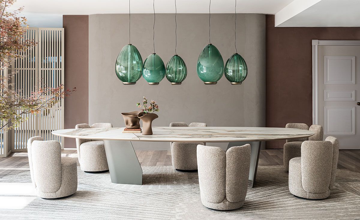 При его использовании как вращающееся кресло для обеденных столов оно выражает величественный стиль с выраженным эффектом. Идеальное сочетание этих кресел с массивным корпусом до пола - с внушительным столом со скульптурным основанием для обстановки с ярко выраженным архитектурным и сценическим характером.
