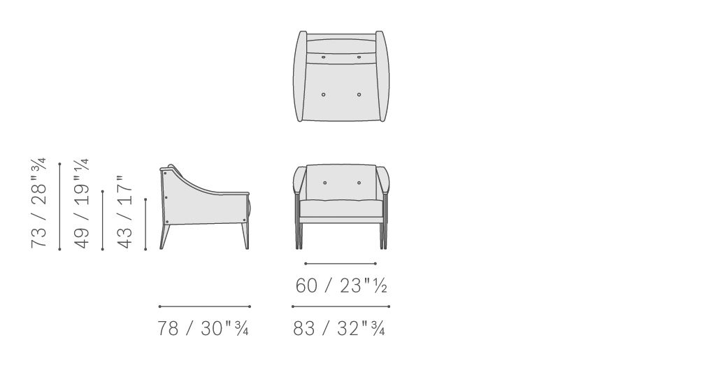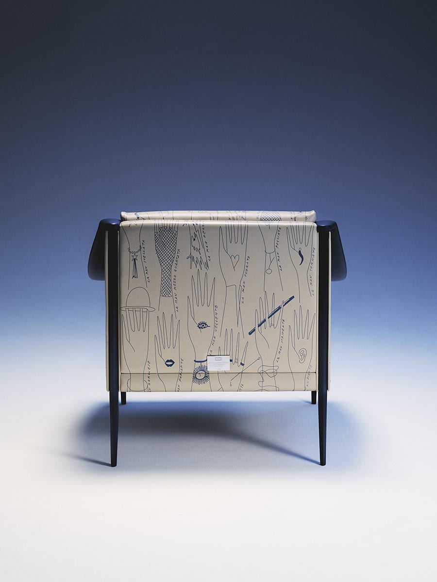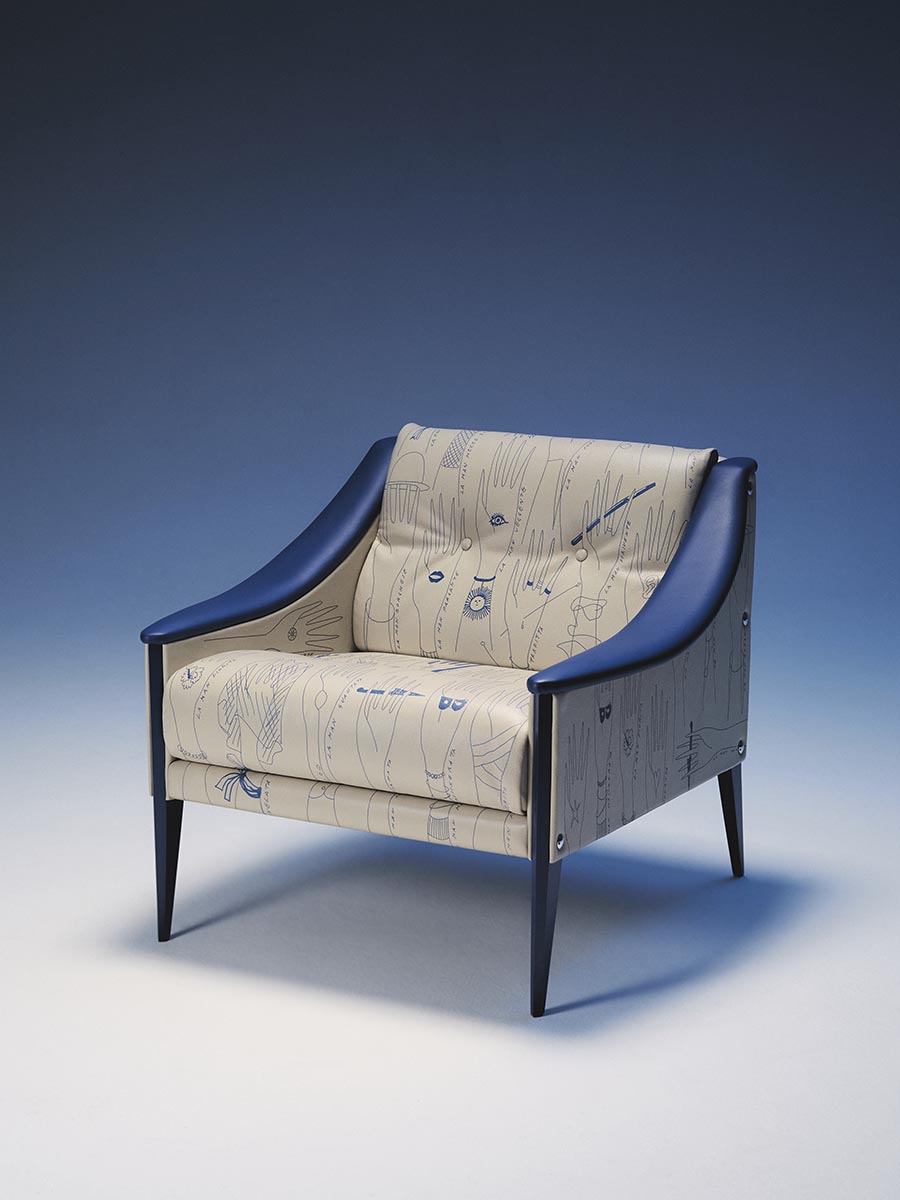 Dezza 60th Anniversary Limited Edition — это мягкое кресло с типично модернистским дизайном, элегантное и лаконичное. Квадратные линии сиденья уравновешиваются элегантными изогнутыми подлокотниками, повторяющими весь профиль кресла вплоть до ножек, придавая изделию ощущение лёгкости и динамики. Dezza 60th Anniversary Limited Edition имеет каркас из массива дерева и обито Pelle Frau® Impact Less. Обивка в цветах «Панна» и «Ирис» воспроизводит оригинальную, неопубликованную иллюстрацию известного миланского архитектора и дизайнера Джо Понти: мотив из 26 стилизованных рук, каждая из которых отличается от другой и имеет своё название и характеристику: «рука в перчатке», «звёздная рука», «вращающаяся рука», «рука гадалки» и так далее. Каждый предмет сопровождается подписанным сертификатом подлинности, индивидуальным номером и маркировкой металлической биркой, прикреплённой к спинке кресла.