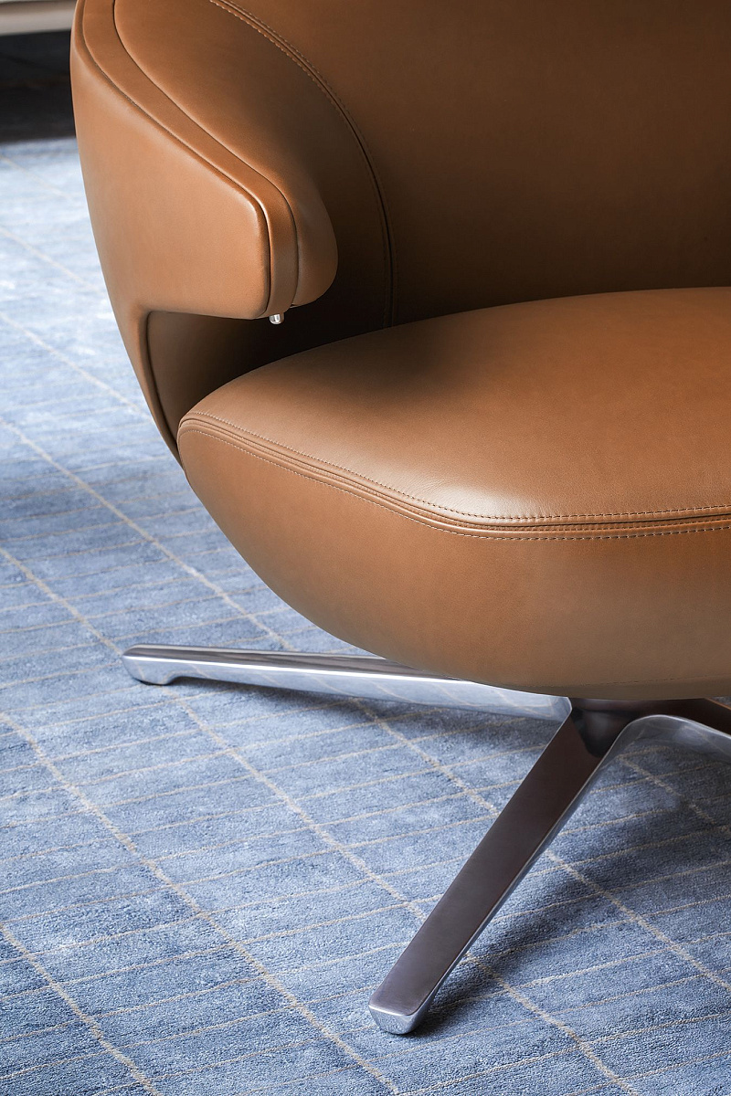 Сиденье кресла Jay Lounge повторяет контуры тела. Геометрия кресла органична, но при этом чёткая и скульптурная. Спинка и сиденье независимы друг от друга. Основание, разработанное специально и отлитое под давлением, допускает вращение на 360° с автоматическим возвратом в исходное положение. Каркас сиденья изготовлен из формованного жёсткого полиуретана, армированного металлическими вставками. Наполнитель выполнен из формованного пенополиуретана и полиэстеровой ваты. Поворотное основание с четырьмя спицами изготовлено из алюминия и доступно в отделках «струйно-полированная» и «полированная». Кожаная обивка Pelle Frau® с изысканной строчкой в тон, украшающей поверхность. Jay Lounge также доступен в версии с ручным механизмом регулировки наклона спинки для регулировки угла наклона спинки. Естественным дополнением к комфорту кресла является пуф Jay Lounge, который, несмотря на столь же чистый и скульптурный дизайн, выполнен из тех же материалов, но с фиксированным основанием.