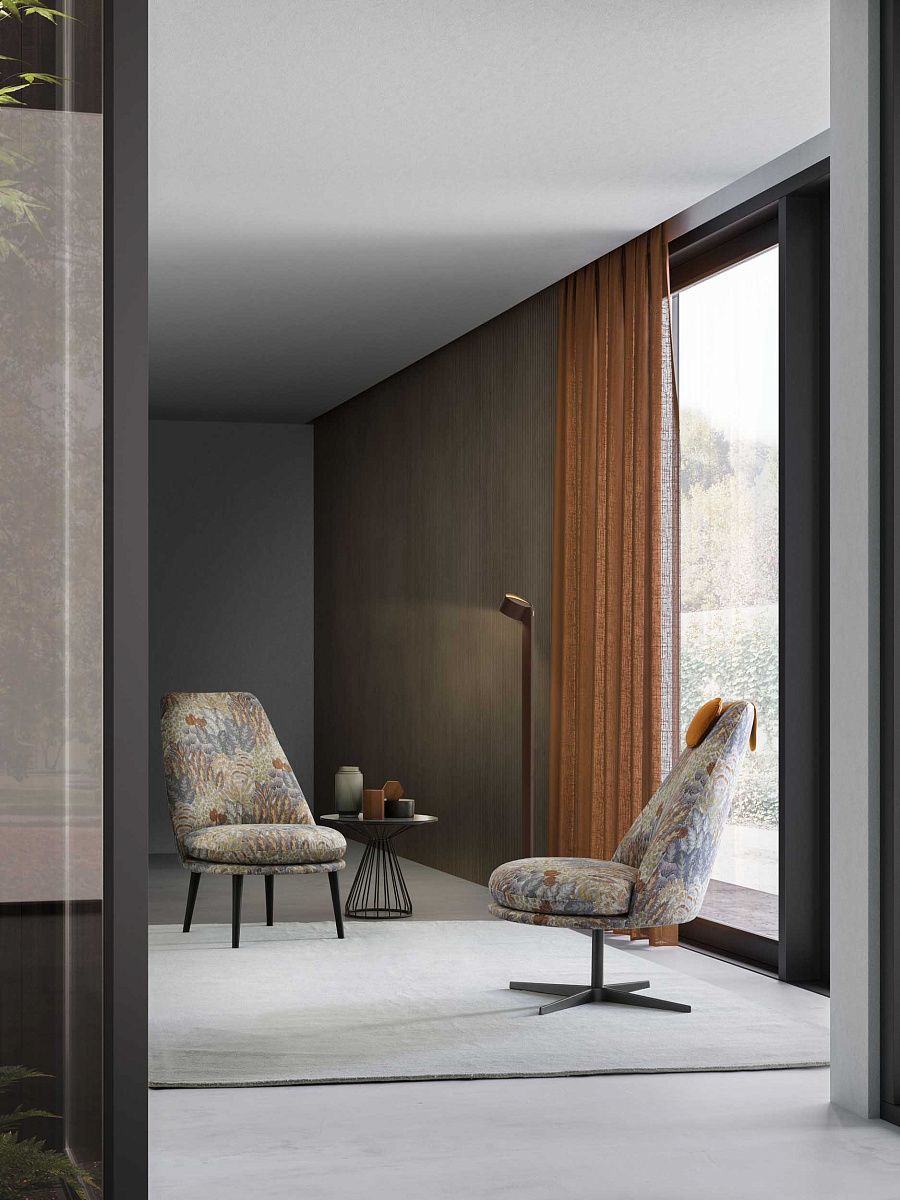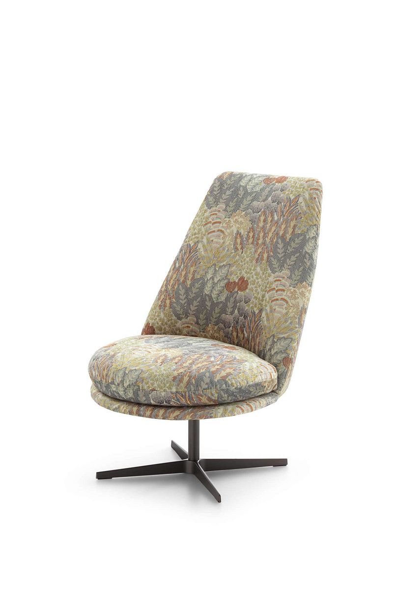 Минималистичное кресло с фиксированным или поворотным основанием, круглым сиденьем и высокой спинкой.