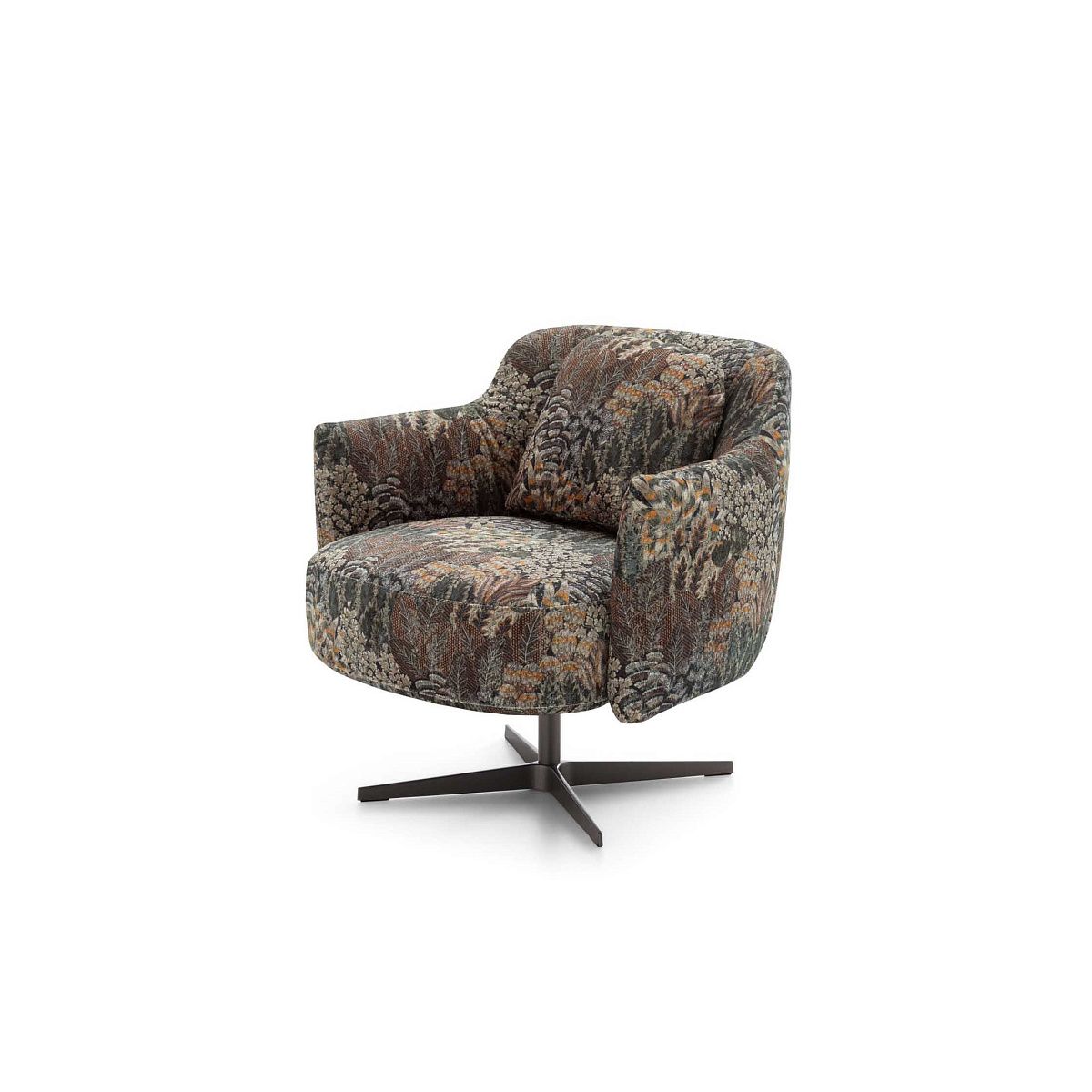 Дизайнерское кресло с фиксированным или поворотным основанием, декоративными подушками на спинке и регулируемыми ножками.