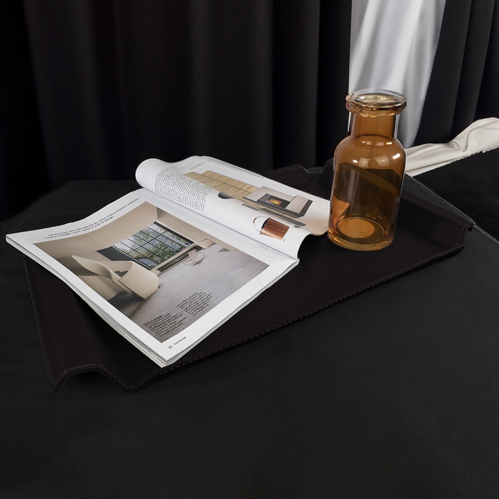 Стальной каркас и кожаная обивка с контрастной строчкой делают его функциональным и прочным. Эргономичные ручки позволяют удобно держать поднос.